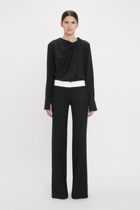 A fresh perspective is brought to the house’s tailoring archive in these Exposed Waistband Trousers. Exquisitely cut from a grain de poudre blend, they have a 1990s-inspired low-rise waistline and flattering wide-leg silhouette. The exposed waistband in contrasting white adds a distinctive design feature, while front side seam pockets bring a traditional finishing touch. Size & Fit - Low rise - Relaxed fit. For a more fitted silhouette, we advise taking a size down - The model height is 5'10''/178cm and is wearing a size 6 - 4cm hem for length alteration Product Details - Grain Depoudre blend fabrication - Front side seam pockets - Exposed waistband detail - Wide leg - Contrasting Waistband - 55% Polyester 45% Wool - Dry clean only - Made In Portugal