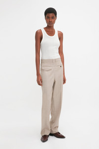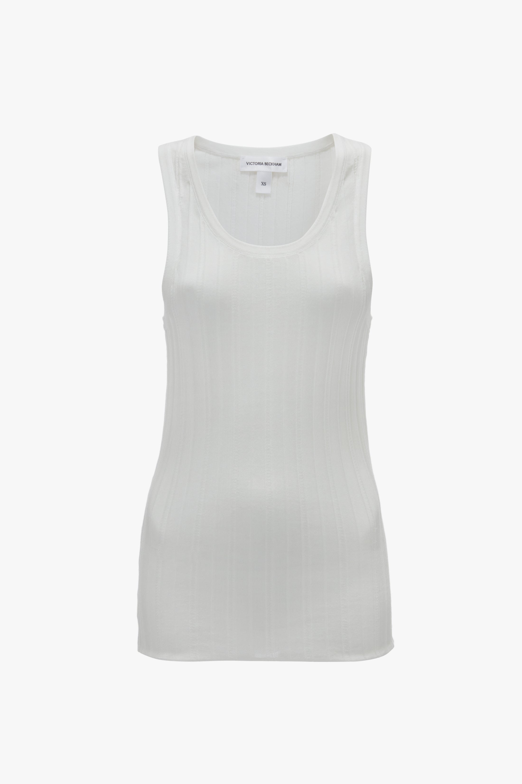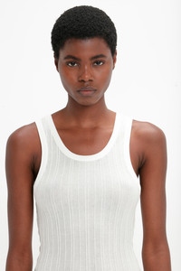 Vertical tonal stripes imbue this Fine Knit Tank with a tactile, textured appearance. Crafted from a breathable, lightweight ribbed knit, it feels super-soft next to the skin. Design details include a scooped neckline and an embroidered Victoria Beckham tape detail at the back of the neck. Styled with the Reverse Front Trouser, Flat Lace Up Mules and the Superfine Rib Socks Product Details - Scooped neckline - Sleeveless - Lightweight rib knit - Embroidered VB detail at back neckline - Vertical stitch stripes - Length: 61.5cm - Fits true to size, take your regular size - The model height is 180cm and is wearing a size XS - 84% Cotton 16% Polyamide - Dry clean only - Made in China