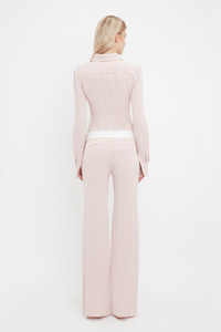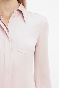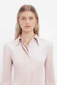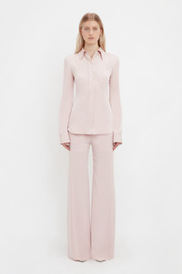 A traditional button-front shirt is reimagined in a sheer fabric and delicate shade of Blush. The silhouette is fitted, and an invisible placket maintains the pared back aesthetic. Subtle but sophisticated points of interest are achieved with patch pockets and a lace Victoria Beckham monogram. Product Details - Cady drap fabrication - Fitted silhouette - Two front chest pockets - For a more relaxed silhouette, we recommend taking a size up - The model height is 180cm and is wearing a size 8. - 60% Acetate 40% Viscose - Dry clean only - Made in Portugal