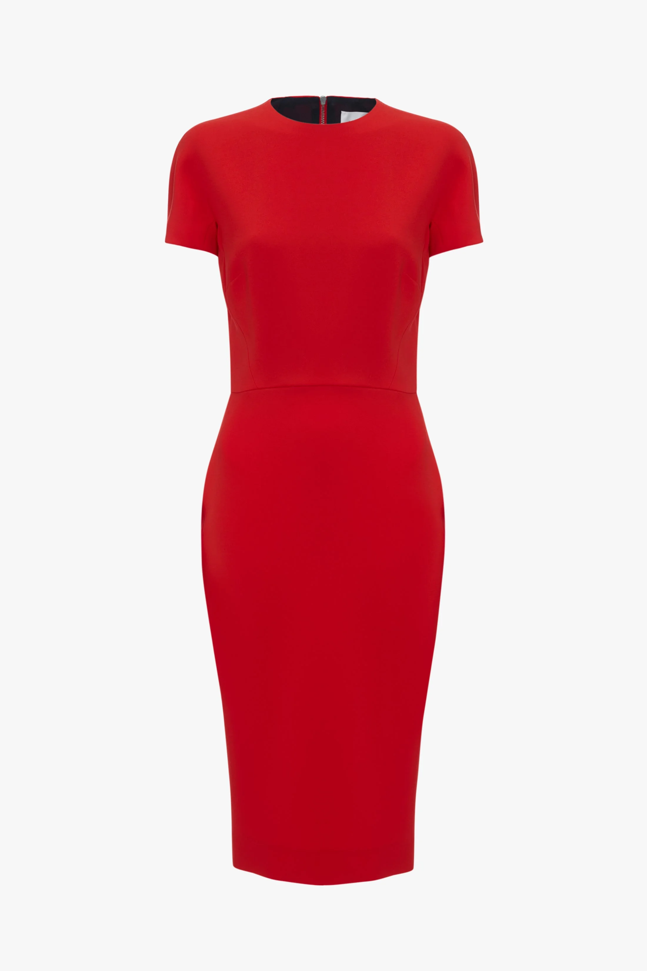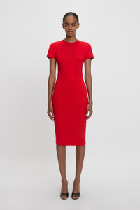 With a modest round neckline, short sleeves and a midi-length hem, this signature Fitted T-shirt Dress has an understated sophistication. Dart details create a defined waistline, while double-ended exposed metal zips to the back add a contemporary design feature. Style simply with the Pointy Toe Stiletto Sandal and the Mini Chain Pouch. Styled with the High Heel Size & Fit - Intended to be fitted, for more relaxed fit take a size up - The model height is 180cm and is wearing a size 6 Product Details - Double Wool Crepe - Waist seam, with dart detailing on skirt - Exposed rear metal zip - 45% Polyester 36% Virgin Wool 16% Polyamide 3% Elastane - Specialised Dry Clean Only - Made in Portugal