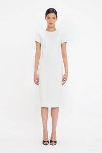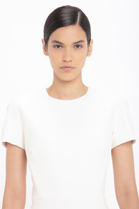 - Double Wool Crepe - Waist seam, complete with dart detailing on skirt - Exposed rear metal zip - 45% Polyester 36% Virgin Wool 16% Polyamide 3% Elastane - Specialised Dry Clean Only - Made in Portugal With a modest round neckline, short sleeves and a midi-length hem, this signature Fitted T-shirt Dress has an understated sophistication. Dart details create a defined waistline, while double-ended exposed metal zips to the back add a contemporary design feature. Style simply with the Pointy Toe Stiletto Sandal and the Mini Chain Pouch. SIZE & FIT - Intended to be fitted, for more relaxed fit take a size up - The model height is 180cm and is wearing a size 6