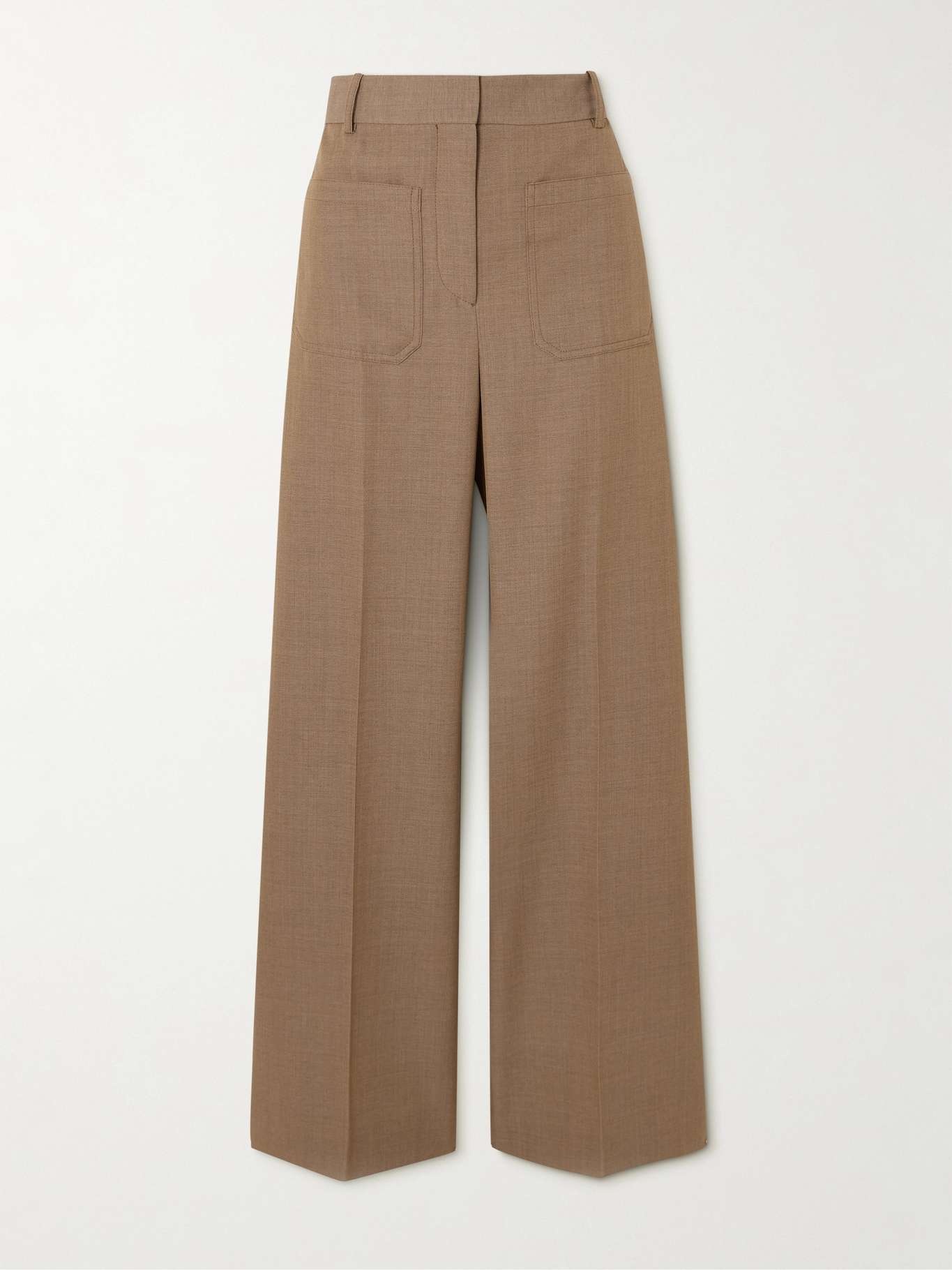 EDITORS'NOTES Victoria Beckham's tailored pants are reminiscent of popular styles from the '70s. They're made from wool and have wide legs detailed with patch pockets. Style yours with a shirt tucked into the high-rise waist. SIZE & FIT Model measurements: - Fits true to size, take your normal size - High-rise, intended for a wide-leg fit - Mid-weight, non-stretchy fabric - Model is 180cm/ 5'11" and is wearing a UK 8 - Bust: 81cm/ 32” - Waist: 65cm/ 25.5” - Hip: 90cm/ 35.5” DETAILS & CARE - Light-brown wool - Concealed button, hook and zip fastening at front - 100% wool; lining: 70% cotton, 30% polyamide - Dry clean - Designer color: Tobacco