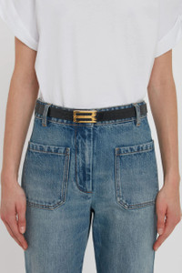 - Croc embossed calf leather - Luxury gold plated hardware - 100% Calf Leather - Wipe clean with a soft, dry cloth - Made In Italy A versatile accessory perfect for adding polish to tailored jeans, T-shirt dresses and louche tailoring, the Dorian Belt is presented in black for the new season. Crafted from tactile croc-embossed calf leather and finished with refined gold hardware, it reflects the house’s detail-driven aesthetic. SIZE & FIT - Small: 70cm, Width 23mm - Medium: 80cm, Width 23mm - Large: 90cm, Width 23mm - X large: 100cm, Width 23mm - Fits true to size, take your regular size