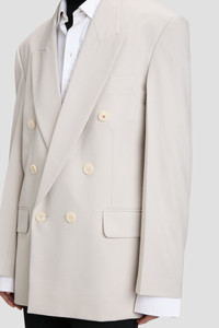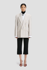 Classic menswear tailoring is reimagined with the house’s signature attention to detail in the Relaxed Double Breasted Jacket. An oversized fit and double-breasted fastening are the defining features, complemented by an elasticated cinch detail at the back waistline, a chain detail at the back of the neck and a single contrasting red stitched button at the front and at either cuff. A subdued shade of Pumice balances the boyish undertone with a feminine energy. Size & Fit - For a more fitted look, take one size down Product Details - Oversized silhouette - Double breasted fastening - Six front button detail, one button with contrast red stitch - Back waist elastic cinch detail - Interrnal chest pocket - Front flap pocket detail - External slanted chest pocket - 53% Polyester 43% Virgin Wool 4% Elastane - Dry clean only - Made in Portugal