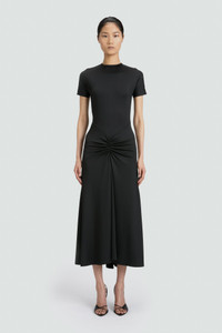 Crafted in stretch jersey for a body-skimming effect, the Gathered Waist T-Shirt Dress has a modest silhouette with round neckline and midi-length hemline. A V-shape seam at the waist with ruching brings a tactile point of difference, while the classic Black colour-way imbues this dress with wear-anywhere appeal. Styled with the Mini Dorian & Harlow Stiletto Size & Fit - Fits true to size, take your regular size - The model height is 5'11"/180cm and is wearing a size 6 Product Details - Midi length - Stretch jersey fabrication - Round neckline - V shape waist seam with centre front ruching - Centre back invisible zip - 90% Polyester 10% Elastane - Dry clean only - Made in Portugal