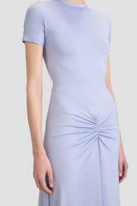 Stretch jersey imbues the Gathered Waist T-Shirt Dress with a figure-flattering silhouette. A modest round neckline and midi-length hemline bring wear-anywhere appeal, while a V-shape seam and tactile ruching at the waist add the house’s distinctive flair. Reimagined in delicate Delphinium Blue, the Gathered Waist T-Shirt Dress blends classic and contemporary references beautifully. Styled with the Sloan Stiletto Size & Fit - Fits true to size, take your regular size - The model height is 5'10 / 178cm and is wearing a size 6 Product Details - Midi length - Stretch jersey fabrication - Round neckline - V shape waist seam with centre front ruching - Centre back invisible zip - 90% Polyester 10% Elastane - Dry clean only - Made in Portugal