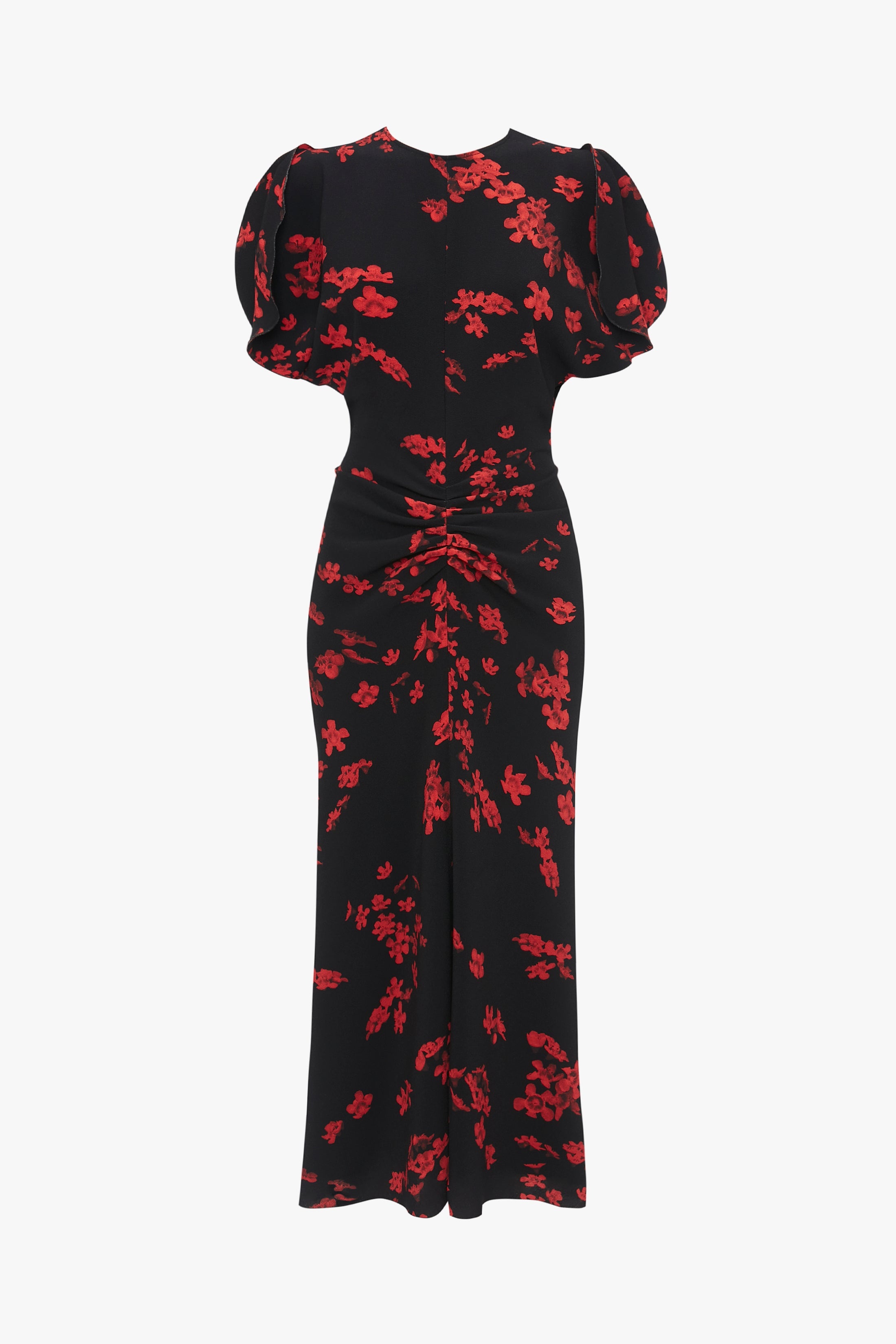 One of Victoria’s personal favourites, the fully lined Gathered Waist Midi Dress in Floral Black balances strength and softness beautifully. The provocative print acts as a contemporary counterpoint to the feminine drape, which gathers gently at the waist before falling into a fit-and-flare silhouette. Distinctive details include exposed seams and a longer-length hem at the back. Styled with the Leather Scarf Product Details - Pleat detail at front skirt - Exposed seam details - Lined in self fabric - Crepe de chine skirt lining - Invisible zip and hook and eye closure at back - Fitted around waist - Gathered front detailing - Fits true to size, take your regular size - The model height is 178cm and is wearing a size 6 - Main: 95% Polyester 5% Elastane - Dry Clean Only - Made In Portugal