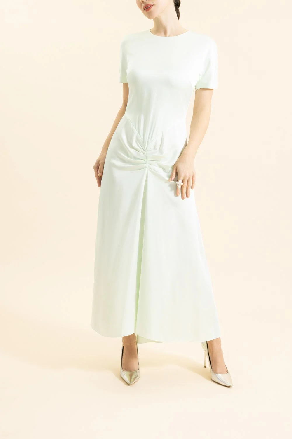 DETAILS AND INSIGHT Victoria Beckham gather midi shirt dress in aloe. Crepe Satin Dry Clean Imported Style 1126WDR006571B-9634