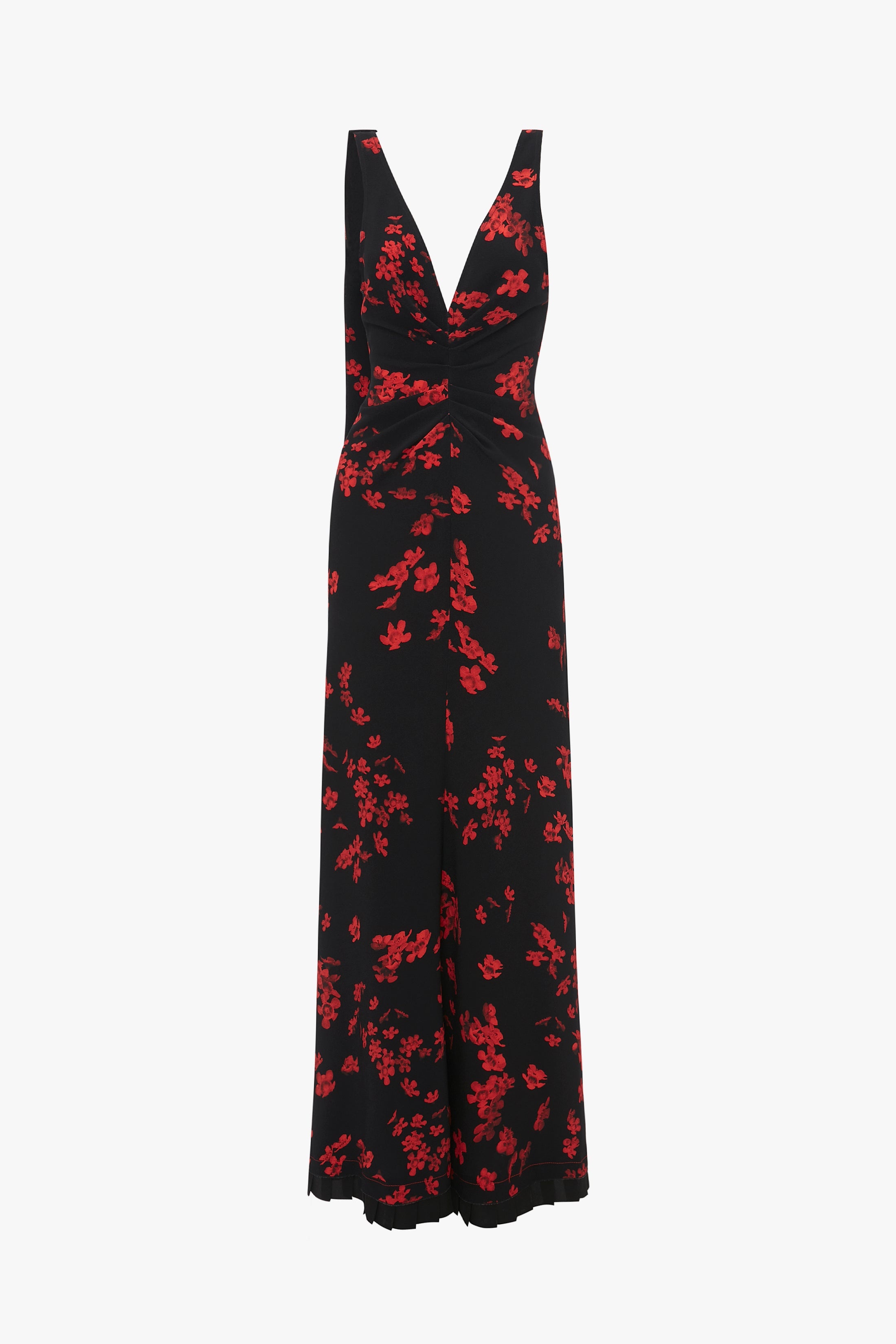 A vibrant floral print imbues the classic hourglass silhouette of this V-Neck Gathered Waist Gown with fresh energy. A deep-V neckline and playfully low scooped back contrast with a demure floor-grazing hemline accented by a contrasting pleated panel. Elevated features include tactile pleats at the waist and ruched detailing at the hip, and a tie detail that falls elegantly from the back of the neck to mid-thigh. Styled with the Leather Scarf Product Details - Deep v-neckline and low scooped back - Tie detail on back shoulder - Pleats on front waist - Curved yoke seams and gathering detail on back hip - Contrast topstitching - Contrast pleated panel - Invisible zip and hook and eye closure at back - Fits true to size, take your regular size - The model height is 178cm and is wearing a size 6 - 95% Polyester 5% Elastane - Dry Clean Only - Made In Portugal