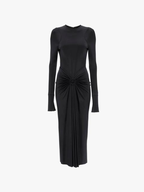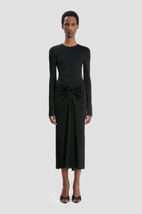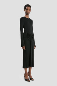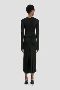The modest and minimalist design of the Long Sleeve Gathered Midi Dress creates a contemporary and confident silhouette. Crafted from stretch jersey with a high shine, it is fitted through the body and sleeve with a godet insert at the back of the skirt for a feminine flare. A circular gathered detail at the front of the skirt creates a flattering focal point, bringing texture and visual interest to the understated aesthetic. Size & Fit - Fits true to size, take your regular size - The model height is 5'10''/179cm and is wearing a size 6 Product Details - Heavy shine stretch jersey - Round neckline - Circle gathered detail on front skirt - Gathering detail to back skirt - Godet insert on back of skirt - Long sleeves with cuff split - 96% Viscose 4% Elastane - Dry clean only - Made In Portugal