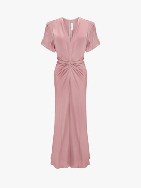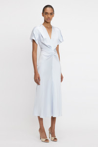 A serene shade of Ice gives the house’s signature Gathered V-Neck Midi Dress a fresh point of view. Cut to fit and flatter the waist and hips but with a relaxed fluidity through the bodice and gently flared skirt, it has both ease and elegance. Hard press details through the skirt and back shoulder bring definition to the silhouette, while exposed seams, pleat details, contrast topstitching and an asymmetric hemline at the back add elevated finishing touches. Styled with the High Heel Size & Fit - Fits true to size, take your regular size - Fitted around the waist with a more relaxed fit through the bodice - The model height is 5’11’’/ 180cm and is wearing a size 6 Product Details - Midi length - Hem graduates to be slightly longer at the back - Front v-neckline - Pleat detail on front waist and front shoulder - Exposed seams and contrast topstitching details - Hard press details through skirt and back shoulder - 100% Crepe back satin - Dry clean only - Made in Portugal