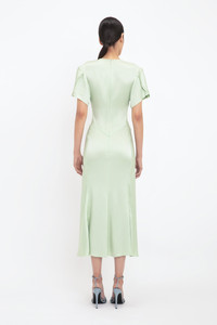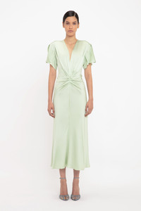 Crafted from crepe back satin, the Gathered V-Neck Midi Dress is shaped at the waistline with a more relaxed fit through the bodice for a laidback but luxe silhouette. Pleat details at the front waist and shoulders bring texture, while hard press details through the skirt and back shoulder add subtle structure. Elevated finishing touches include exposed seams, contrast topstitching and a longer-length hemline at the back. Size & Fit - Fits true to size, take your regular size - The model height is 5'10''/179cm and is wearing a size 6 - Fitted around the waist with a more relaxed fit through the bodice Product Details - Front v-neckline - Pleat detail on front waist and front shoulder - Exposed seams and contrast topstitching details - Hard press details through skirt and back shoulder - Concealed zip with hook and eye closure at back - Hem graduates to be slightly longer at the back - 89% Wool 7% Polyamide 4% Elastane - Dry clean only - Made In Portugal