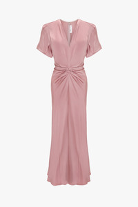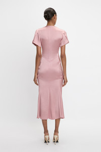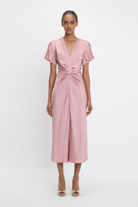 One of the house’s signature styles, the Gathered V-Neck Midi Dress is reimagined in an elegant shade of Peony for the new season. A softly curved V neckline and waist-defining pleat detail add definition to an otherwise fluid silhouette, while a longer-length hem at the back adds a directional point of difference. Elevated design details include exposed seams, a contrasting topstitch and hard press detailing through the skirt and back shoulder. Styled with the High Heel Product Details - Midi length - Hem graduates to be slightly longer at the back - Front v-neckline - Pleat detail on front waist and front shoulder - Fitted around the waist with a more relaxed fit through the bodice - Exposed seams and contrast topstitching details - Hard press details through skirt and back shoulder - Fits true to size, take your regular size - 71% Acetate 29% Viscose - Dry clean only - Made In Portugal