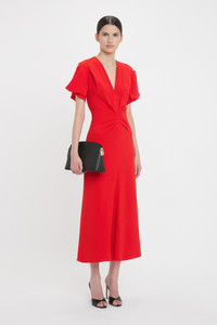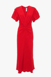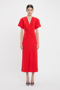 Shaped at the waistline with a more relaxed fit through the bodice, the Gathered V-Neck Midi Dress has a laid-back luxuriousness. Pleat details at the front waist have a flattering effect, while shoulder pleats add visual interest and texture. Hard press details through the skirt and back shoulder add a hint of formality that is punctuated by the playful shade of Tomato. Elevated finishing touches include exposed seams, contrast topstitching and a longer-length hemline at the back. Size & Fit - Fits true to size, take your regular size - Fitted around the waist with a more relaxed fit through the bodice - The model height is 5'10''/179cm and is wearing a size 6 Product Details - Front v-neckline - Pleat detail on front waist and front shoulder - Exposed seams and contrast topstitching details - Hard press details through skirt and back shoulder - Concealed zip with hook and eye closure at back - Hem graduates to be slightly longer at the back - 50% Viscose 47% Acetate 3% Elastane - Dry clean only - Made In Portugal