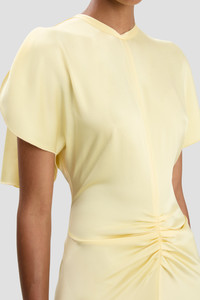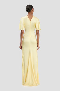 A demure front neckline and floor-pooling hemline playfully contrast with the seductive open-back design of the Gathered Waist Floor-Length Dress. Presented in a refined shade of Daffodil Yellow, it is crafted from luxurious crepe back satin for an effortlessly elegant drape and is fitted at the waist and hip for a flattering hourglass silhouette. Tactile pleating at the skirt brings a sensuous point of difference, while exposed seams with a contrasting topstitch add an attractive finishing touch. Size & Fit - Fitted around the waist and hip - Fits true to size, take your regular size - The model height is 5'10’’/178cm and is wearing a size 6 Product Details - Crepe back satin gown with pleat detail - Pleat detail at front waist - V-shape exposed back waist seam - Tonal topstitching at back waist and side seams - Hem graduates to be slightly longer at the back - 71% Acetate 29% Viscose - Dry clean only - Made in Portugal