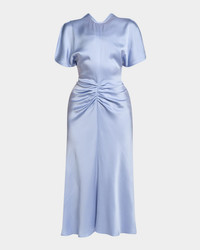 - Victoria Beckham lustrous satin dress accented with a gathered waist detail - Crew neckline - Short sleeves - Hem falls below the knee - Invisible back zipper - Acetate/viscose - Dry clean - Made in Portugal