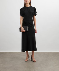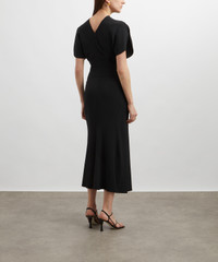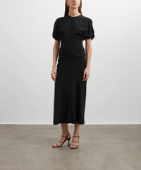 DETAILS Black midi dress Fitted waist Pleat and gathered detail on the front Short tulip sleeves Round neckline Back V-neckline Invisible zip with hook-and-eye closure SIZE & FIT Model is 178cm/5'10"; Chest: 81cm; Waist: 66cm; Hip: 91cm and wears a size 8 COMPOSITION & CARE 100% Polyester Dry clean