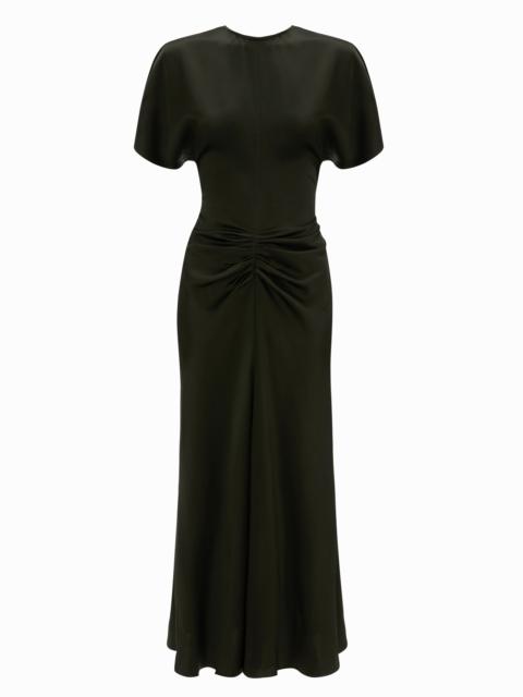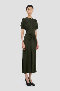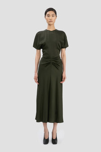 The Gathered Waist Midi Dress delivers a professional and polished aesthetic. Presented in dark olive, it has a waist and hip-hugging cut and a fluid skirt with a longer-length hem at the back. A pleated detail at the waist adds a sensuous point of interest, while a V-shape waist seam at the back is mirrored by a subtle V-shape neckline, also at the back. Size & Fit - Fits true to size, take your regular size - Fitted around the waist and hip - The model height is 5'11’’/180.5cm and is wearing a size 6 Product Details - Crepe back satin midi dress with pleat detail - Round front neckline, v-shape back neckline - Pleat detail - V-shape exposed back waist seam - Hem graduates to be slightly longer at the back - 71% Acetate 29% Viscose - Dry Clean Only - Made in Portugal
