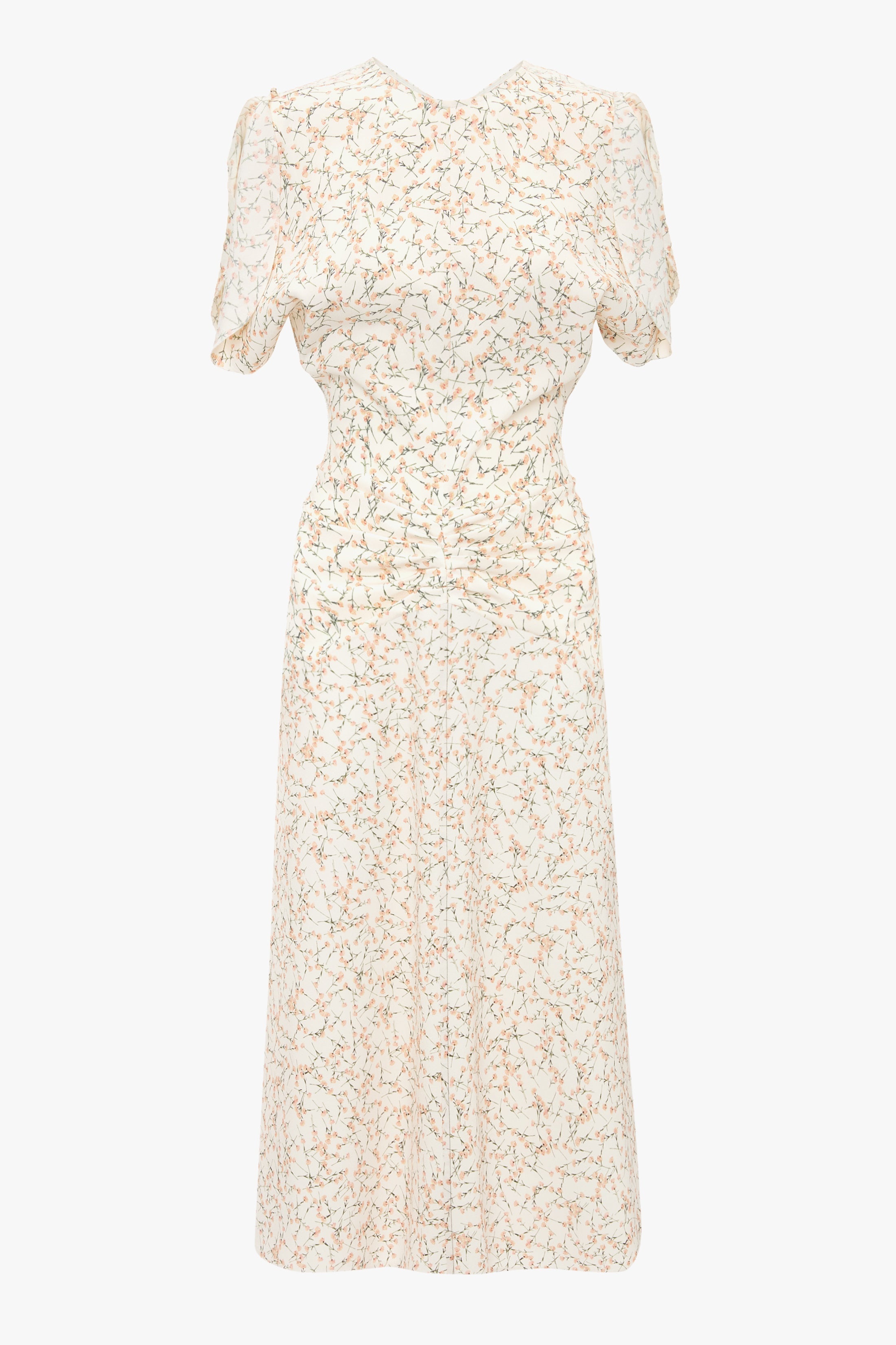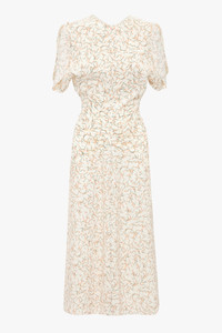 A charming peach floral print breathes fresh personality into the house’s Gathered Waist Midi Dress. Signature gathered detailing at the waist creates a flattering focal point, while a round front neckline and V-shaped neckline at the back looks unexpected and modern. Exposed seams, contrast topstitch details and a longer-length hemline at the back add visual interest. Product Details - Round front neckline, v-shape back neckline - Pleat detail on front waist - V-shape back waist seam - Fitted around the waist and hip - Exposed seams and contrast topstitching details - Concealed zip with hook and eye closure at back - Hem graduates to be slightly longer at the back - Fits true to size, take your regular size - The model height is 5'10''/179cm and is wearing a size 6 - 55% Viscose 45% Acetate - Dry clean only - Made In Portugal