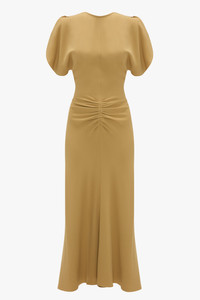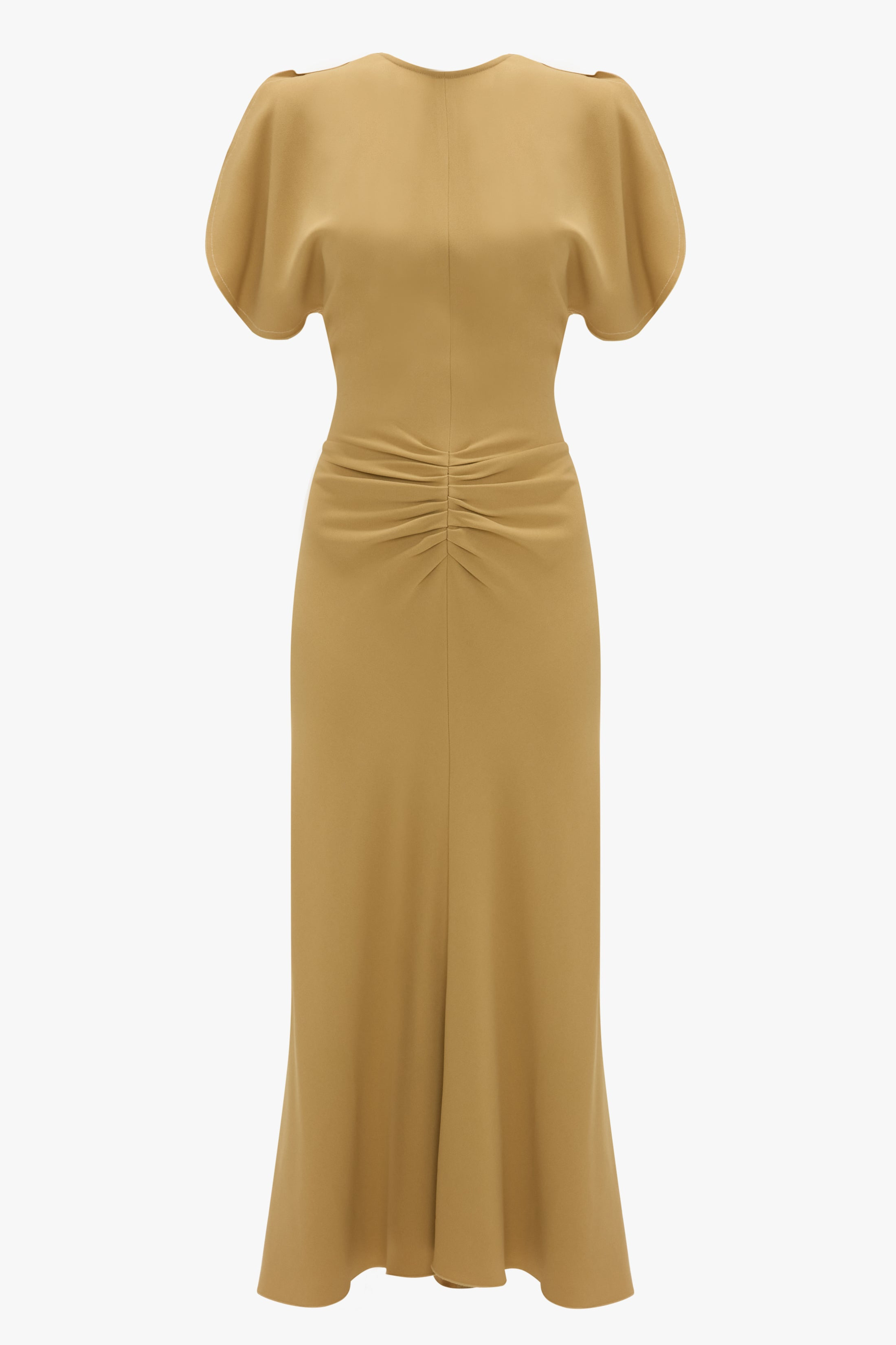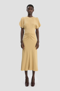 Presented in a warm shade of Honey, the Gathered Waist Midi Dress is a house favourite, delivering a professional and polished aesthetic. A waist and hip-hugging cut offers a flattering and forgiving silhouette, while a pleated detail at the waist and V-shape waist seam at the back add sensuous talking points. Finished with a contrasting topstitch and a longer-length hem at the back, it is a wear-anywhere piece. Size & Fit - Fits true to size, take your regular size - The model height is 5'11’’/180cm and is wearing a size 6 Product Details - Fluid cady midi dress with pleat detail - Round front neckline, v-shape back neckline - Pleat detail at front waist - V-shape exposed back waist seam - Hem graduates to be slightly longer at the back - 50% Viscose 47% Acetate 3% Elastane - Dry Clean Only - Made in Portugal