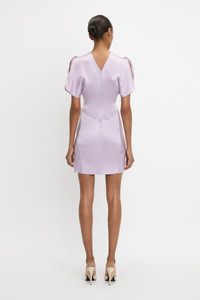 Polished and playful, the Gathered Waist Mini Dress in Petunia hugs the hips and waist for a figure-flattering silhouette. The short hemline, pleat detailing at the waist and teasing tulip sleeves add a coquettishness that speaks to the brand’s humorous side. Exposed seams add a sophisticated edge. Styled with the High Heel Size & Fit - Fits true to size, take your regular size - Fitted around the waist and hip - The model height is 5’11’’/ 180cm and is wearing a size 6 Product Details - Mini length - Round front neckline, v-shape back neckline - Pleat detail on front waist - V-shape back waist seam - Concealed zip with hook and eye closure at back - 100% Crepe back satin - Dry clean only - Made in Portugal