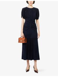 PRODUCT DETAILS - Victoria Beckham velvet midi dress - 50% viscose, 47% acetate, 3% elastane - Concealed zip fastening at back - Slim fit, round neck, short tulip sleeves, gathered waist, V-back, fit-and-flare silhouette, midi length - Specialist dry clean only - Made in Mauritius - True to size - Size UK 8: length 52in / 132cm - Model is 5ft 10in/1.78m and wears a size UK 8 - Midweight, non-stretch Ref: R04536553