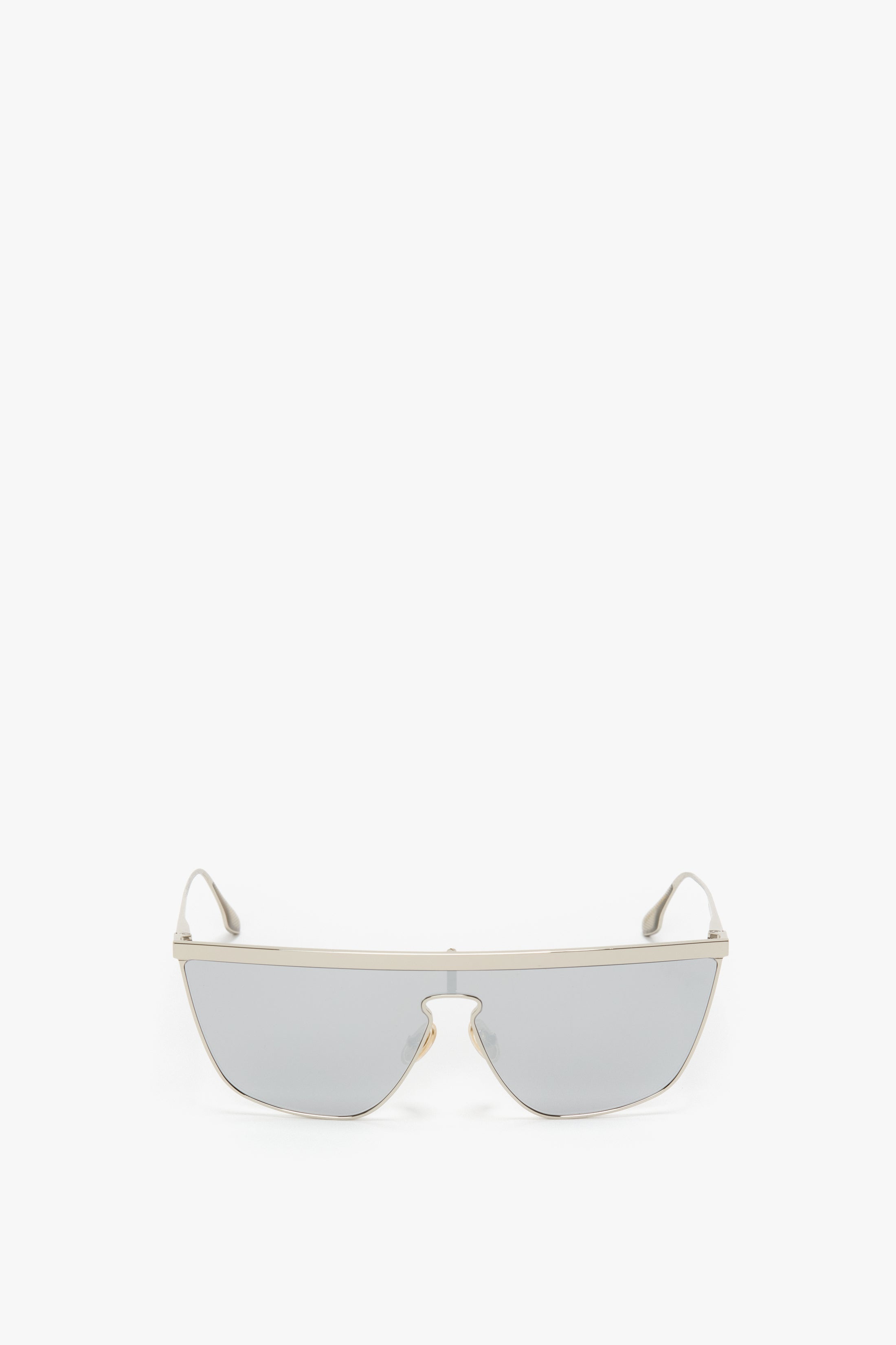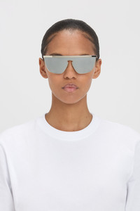 Introducing the Geometric Visor Sunglasses, a new addition to the Victoria Beckham eyewear collection for AW24. Featuring the iconic visor silhouette, they have a fine metal frame in silver which encases sleek mirrored lenses. Adorned with the classic Victoria Beckham logo and adjustable nose pads for comfort and fit. Size & Fit - Lens: 59mm, Bridge: 20mm, Temple: 140mm Product Details - Iconic visor silhouette - key to VB Eyewear - Lens is mirrored - Fine metal frame in silver - Logo featured on the temples - Adjustable nose pads to achieve desired fit - Made in Italy - Wipe clean with soft, dry cloth