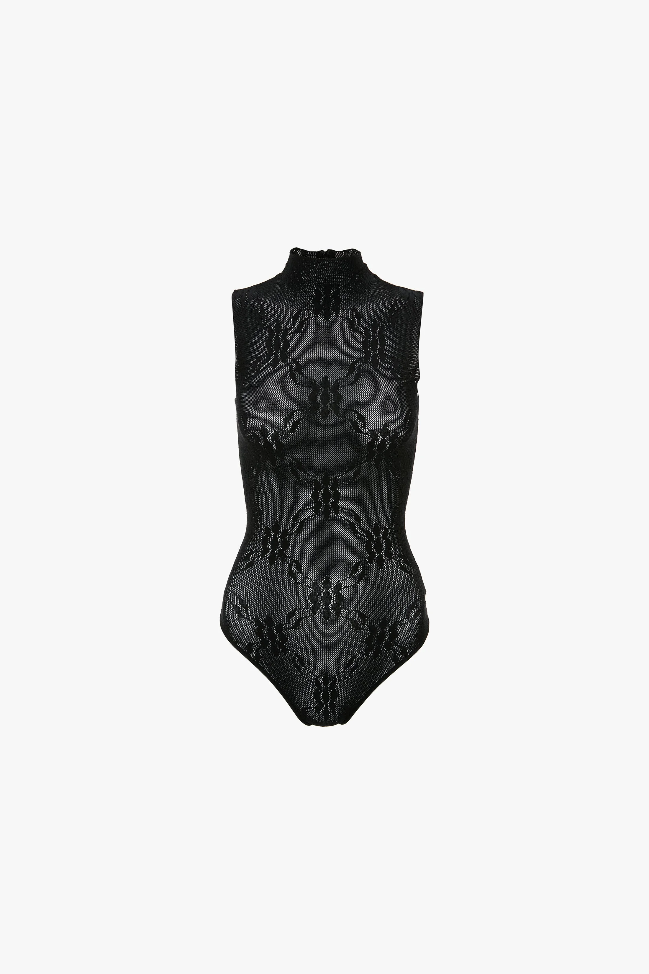 - Fitted funnel neck - Sleeveless - Sheer lace pointelle knit - Bodysuit with adjustable snap closure - Centre back concealed zip - 83% Viscose 17% Nylon - Dry clean only - Made in China Presented in classic Black, the High Neck Bodysuit is a foundational piece for any wardrobe. Meticulously crafted from a sheer lace pointelle knit, it has a sleeveless silhouette, fitted funnel neck, adjustable snap closure and a centre back concealed zip. A SS25 highlight and a favourite of Victoria’s, it exudes a sexy sophistication. SIZE & FIT - Fits true to size, take your regular size - The model is 177cm and is wearing a size XS