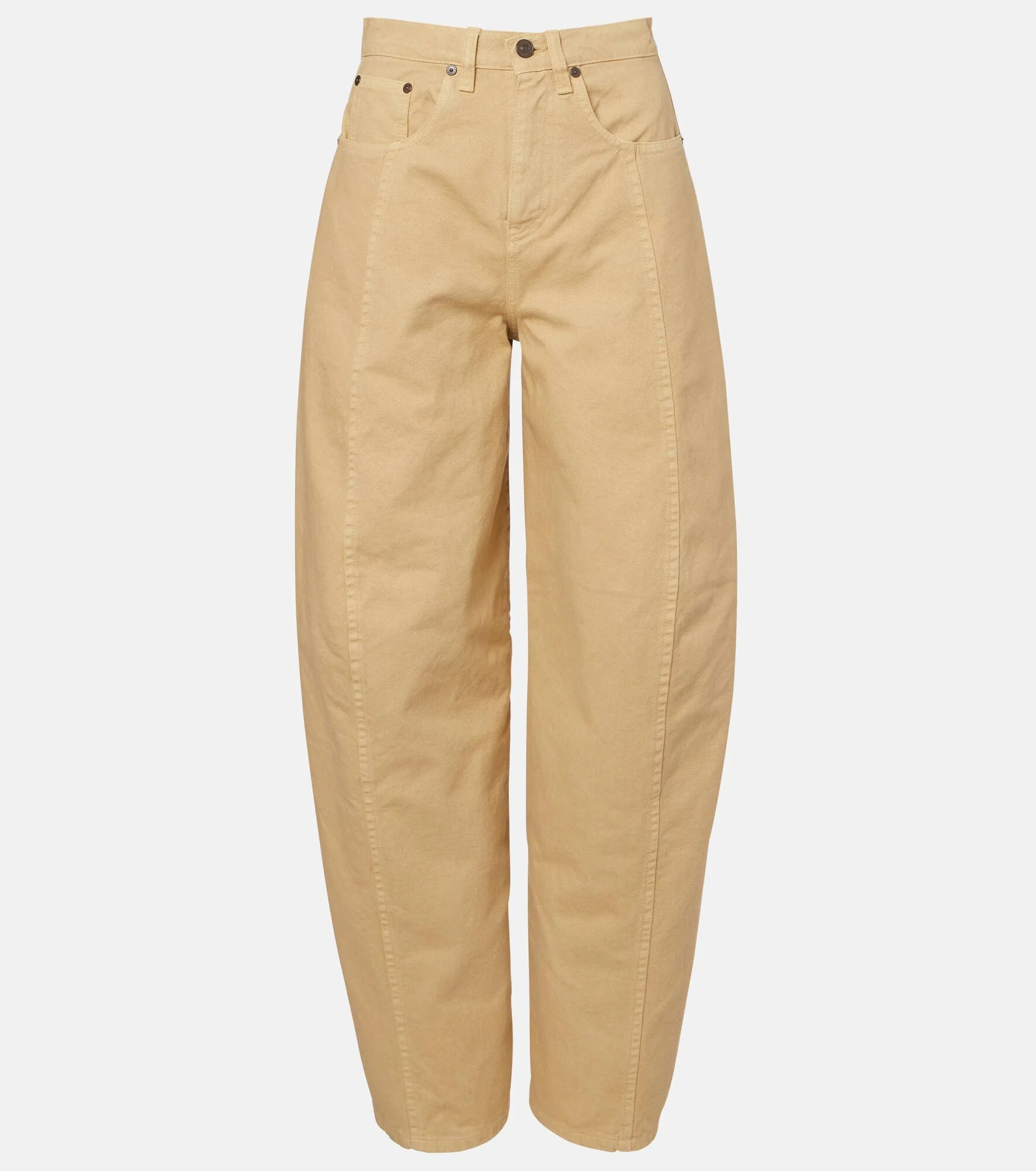Victoria Beckham's eponymous label centers around chic, understated styles. These barrel-leg jeans are made from yellow cotton denim and have a high-rise silhouette. Product Details - Material: 100% cotton - Care instructions: machine wash at 30 degrees - Made in Italy - Designer color name: Butter Yellow Garment Dye - Item color: beige - Details: 100% leather - Pocket lining: 65% polyester, 35% cotton - Closure: zip and button fastening - Pockets: five pockets - Belt loops - Item number: P01091631 Size & Fit - True to size - Non-stretchy fabric - Tapered leg - High-rise - The model seen in the picture is 178cm-5'10" and wearing a size 26