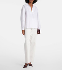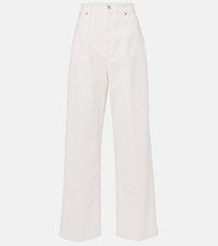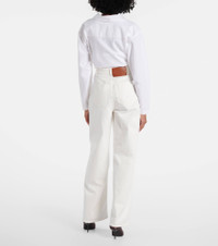 Victoria Beckham’s eponymous label centers around chicly understated styles to create a versatile wardrobe – these jeans feature a high-rise waist and straight-leg cut, offering a timeless shape with modern polish. Product Details - Material: 100% cotton - Care instructions: machine wash at 30 degrees - Made in Italy - Designer color name: Washed White - Item color: white - Pocket lining: 65% polyester, 35% cotton - Trim: 100% leather - Closure: zip and button fastening - Contains non-textile parts of animal origin - High-rise - Fit: wide-leg - Item number: P01053796 Size & Fit - True to size - Non-stretchy fabric - Straight leg - High-rise - The model seen in the picture is 178cm-5'10" and wearing a size 26