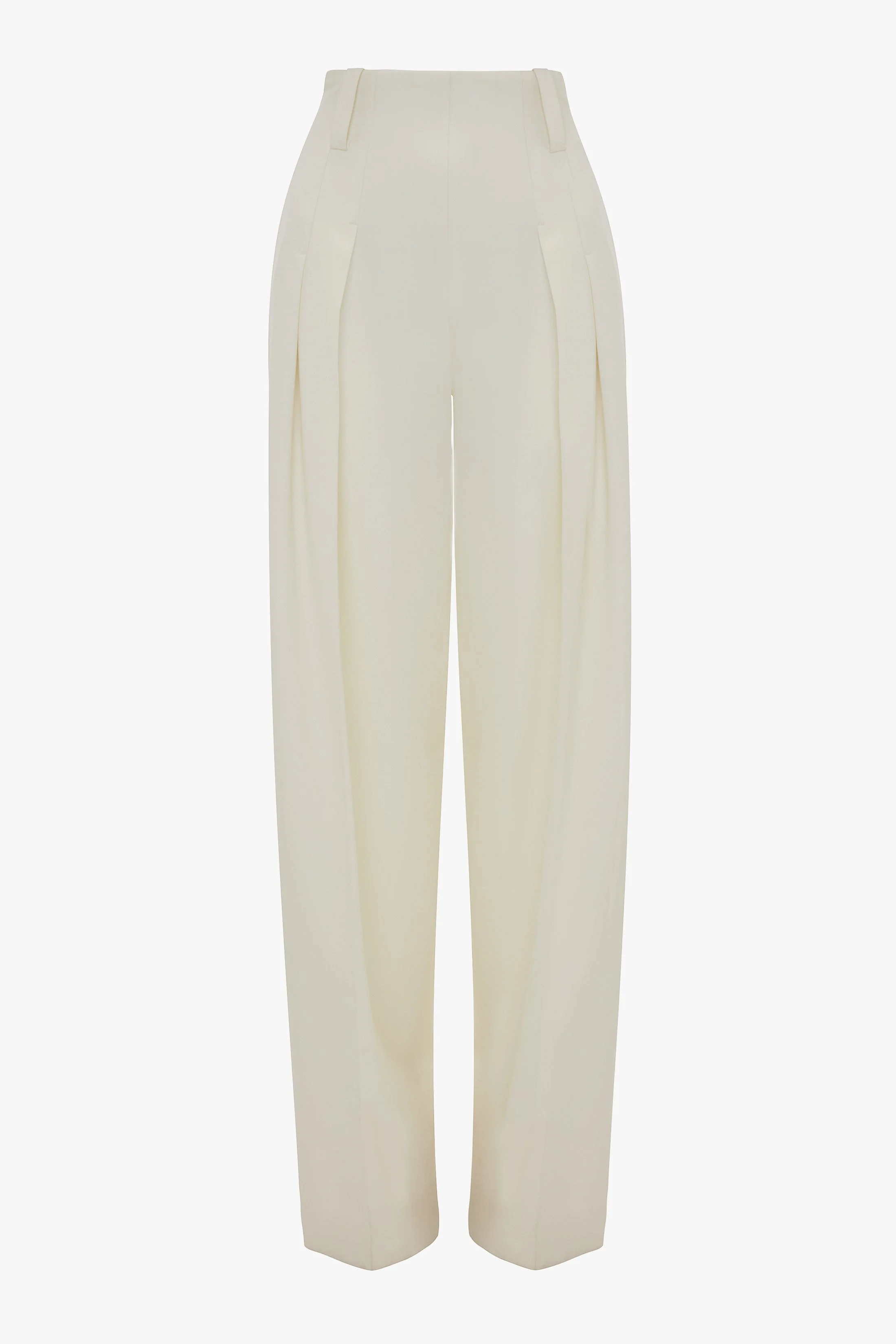 The High Waist Cinched Trouser embodies relaxed refinement. Characterised by a high waisted fit, pleats at the front and darts at the back, it has an informal silhouette perfect for transitioning from day to night. Lined with power mesh and finished with a side pocket inserted into the seam, it is presented in romantic Ivory for a subtly feminine point of difference. Styled with the High Neck Top & Frame Belt Size & Fit - Fits true to size, take your regular size Product Details - Fresh wool fabrication - High waist - Internal powermesh lining - Front pleat detail - Back dart stitch detail - Side pocket inserted into seam - Back single jet pockets - 50% Wool 50% Polyester - Dry clean only - Made in Portugal