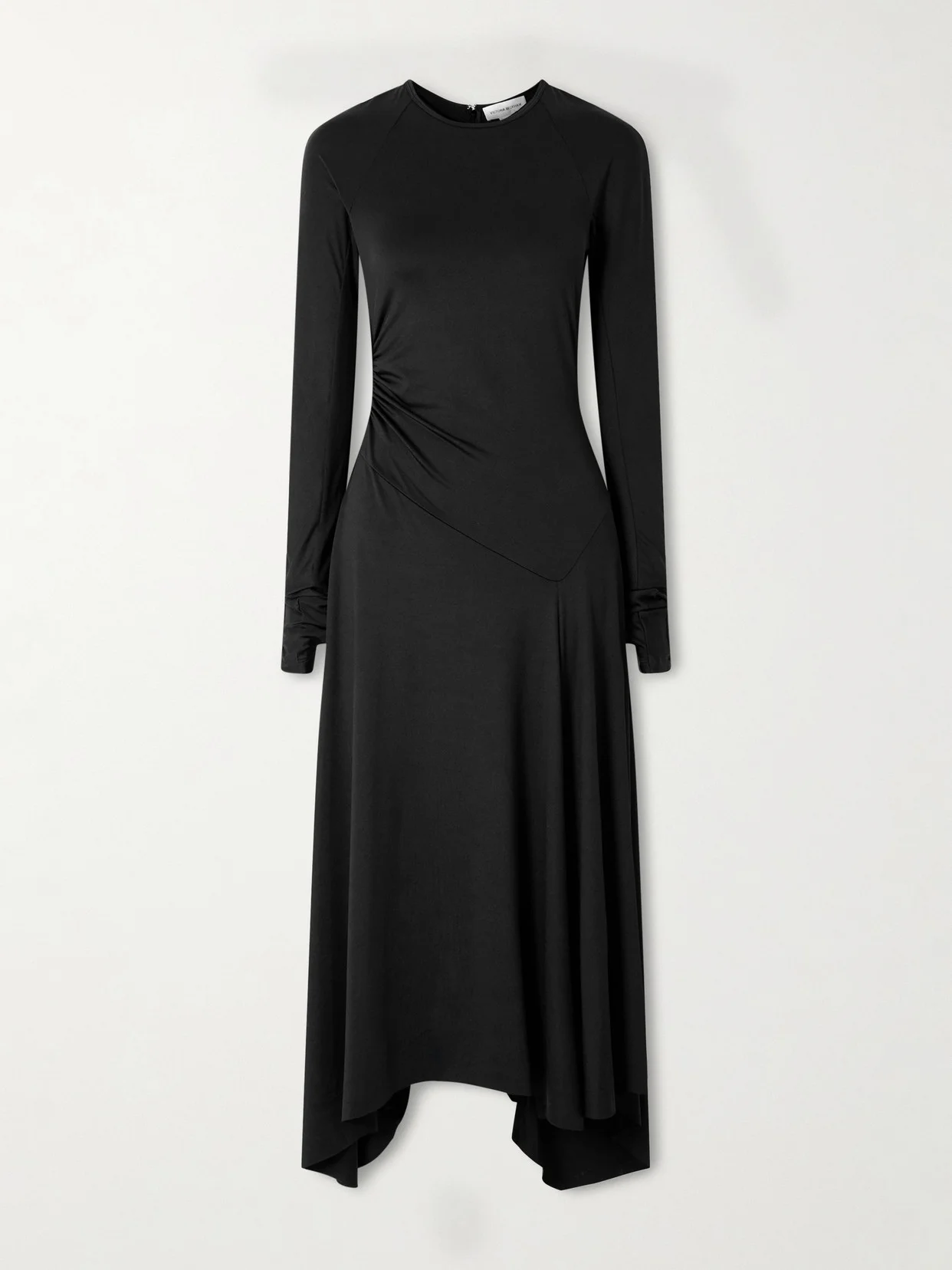The waterfall-inspired silhouette of Victoria Beckham's dress captures beautiful movement. It's made from panels of slinky stretch-jersey to gather at your waist and falls to an asymmetric midi hem. The long sleeves are cut with thumbholes for a sporty feel.