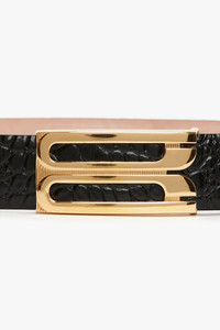 Ideal for adding a directional talking point to tailored separates and feminine midi dresses, the utilitarian-inspired Jumbo Frame Belt is reimagined in sophisticated Black for the new season. Crafted from croc-embossed calf leather and embellished with luxury gold hardware for an elevated finish, it is a signature piece in the house’s leather goods archive. Size & Fit - Fits true to size, take your regular size - Small: Length 70cm, Width 38mm - Medium: Length 80cm, Width 38mm - Large: Length 90cm, Width 38mm - X large: Length 100cm, Width 38mm Product Details - Croc embossed calf leather - Embellished with gold hardware - 100% Smooth Calf leather - Wipe clean with a soft, dry cloth - Made In Italy
