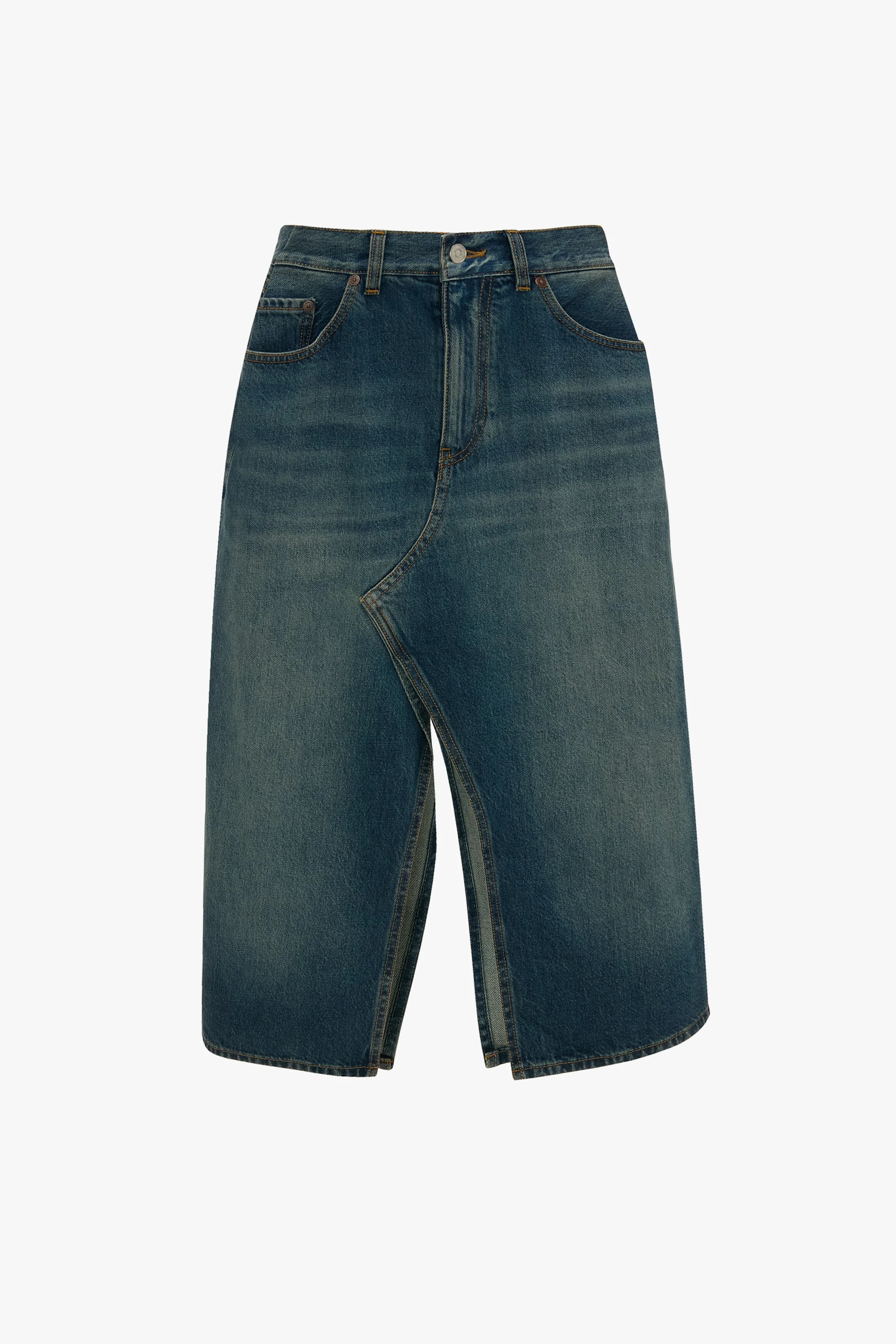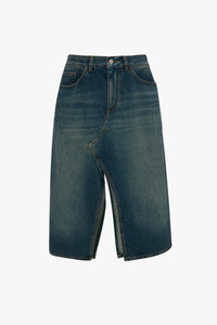 Blending feminine and utilitarian references, the Kick Pocket Denim Skirt has a contemporary sophistication. A low-rise waist and Mid Blue Wash imbue it with an off-duty attitude, while a pleated detail at the pockets and front and back splits inject a seductive undertone. Crafted from a non-stretch, mid-weight denim, it is finished with a branded leather patch and tobacco topstitching. Size & Fit - Fits true to size, take your regular size - The model height is 5'11’’/180cm and is wearing a size 25 Product Details - Washed blue, pleat detail midi skirt - Mid rise - Non-stretch mid-weight denim - Pleat detail at front pockets - Front and back splits - Front fly with zip and branded denim shank button - Branded leather patch on right back waistband - 100% Cotton - Machine wash at 30C - Made in Italy