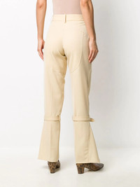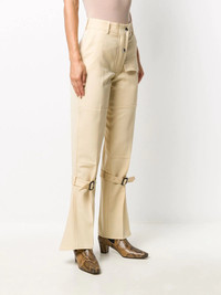 knee-strap flared trousers Skinny-fit trousers fatigue? Switch it up with these flared trousers and feel renewed - both you and your wardrobe. Victoria Beckham wants you to never feel bored. Highlights - Beige - Wool - Belt loops - High waist - Front button fastening - Flared - Front flap pocket - Buckle-fastening knee strap Made in United Kingdom Composition Lining: Polyester 65%, Cotton 35% Outer: Virgin Wool 100% SIZE & FIT Model measurements Height 5 ft 11 in(1.8 m) Bust/Chest 33.07 in(84 cm) Hips 37.4 in(95 cm) Waist 25.19 in(64 cm) Measurement INSIDE LEG 33.07 in(84 cm) HIPS 37.4 in(95 cm) WAIST 27.16 in(69 cm) FittingInformation This piece fits true to size. We recommend you get your regular size Designed to be fitted at the waist and through the thigh, loose from the knee Made with a mid-weight non-stretch fabric Washing instructions Dry Clean Only