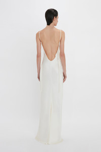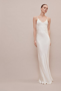 - Lace applique detail - Low back - Bias cut - Back tie details - 71% Acetate 29% Viscose - Specialised dry clean only - Do not press, steam only - Made in UK Crafted from crepe back satin, this camisole-style evening dress has a bias cut for a figure-flattering drape. Resonant of 1990s slip dresses, this exclusive piece has a low back, thin spaghetti straps and playful tie details on the back of each strap. Finished with a romantic lace applique detail, it embodies modern elegance. SIZE & FIT - Fits true to size, take your regular size - The model height is 178cm and is wearing a size 6 - Length (measured from waist): 120cm
