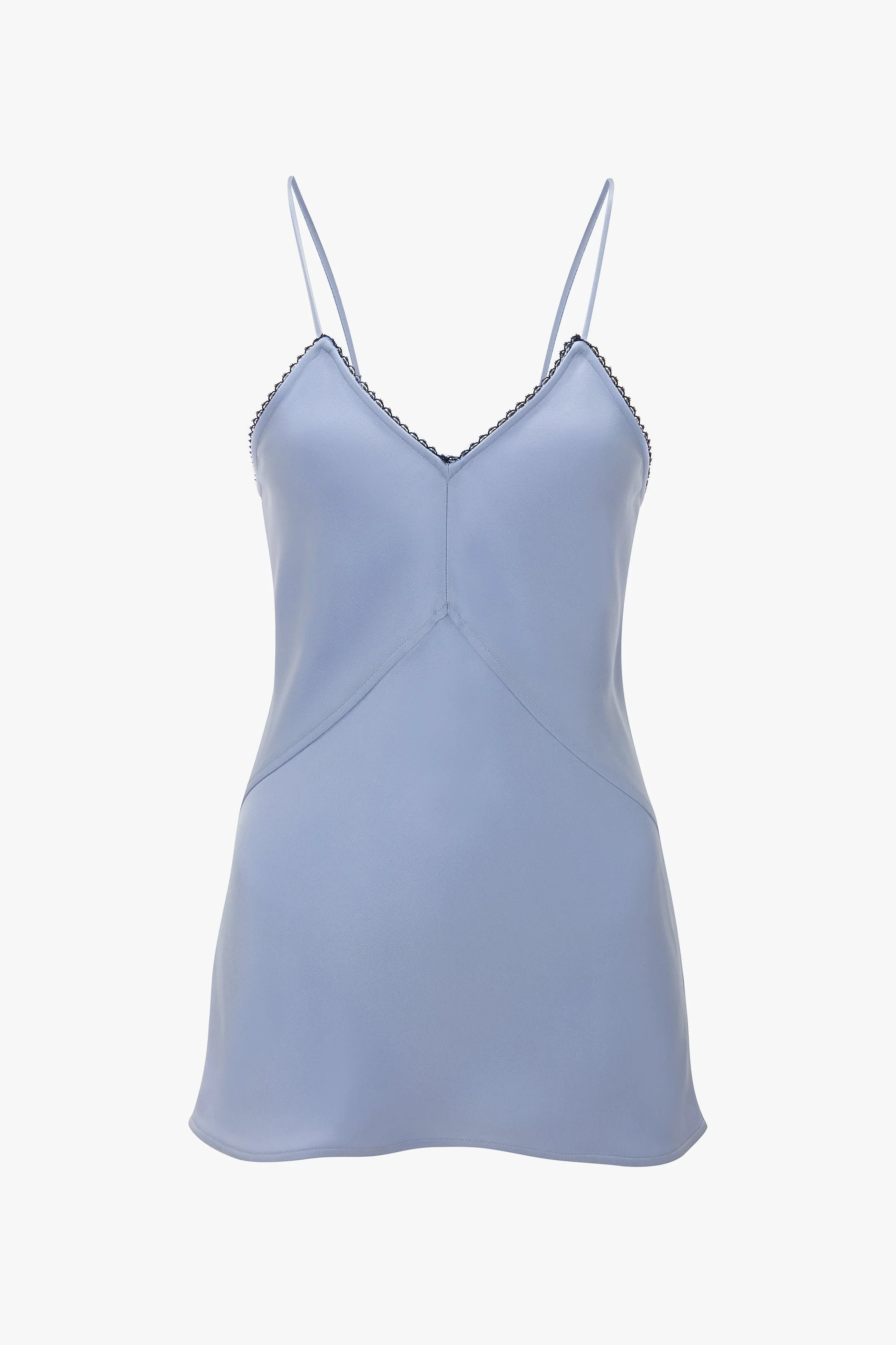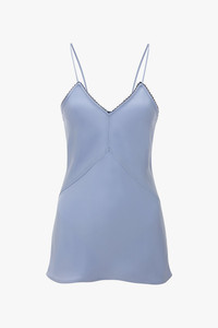 The quintessential 1990s cami top is reimagined with a tactile lace trim at the neckline. Front and back diagonal seams with topstitching add further visual interest, while rouleau straps with an excess for alteration ensure absolute comfort and versatility. Presented in a subdued shade of Delphinium Blue, it is a romantic and refined piece for the new season. Size & Fit - Fits true to size, take your regular size Product Details - Satin fabric with contrast lace detail neckline - Self rouleau straps with excess for alteration - Front and back diagonal seam detailing with topstitch - 71% Acetate 29% Viscose - Dry clean only - Made in Portugal