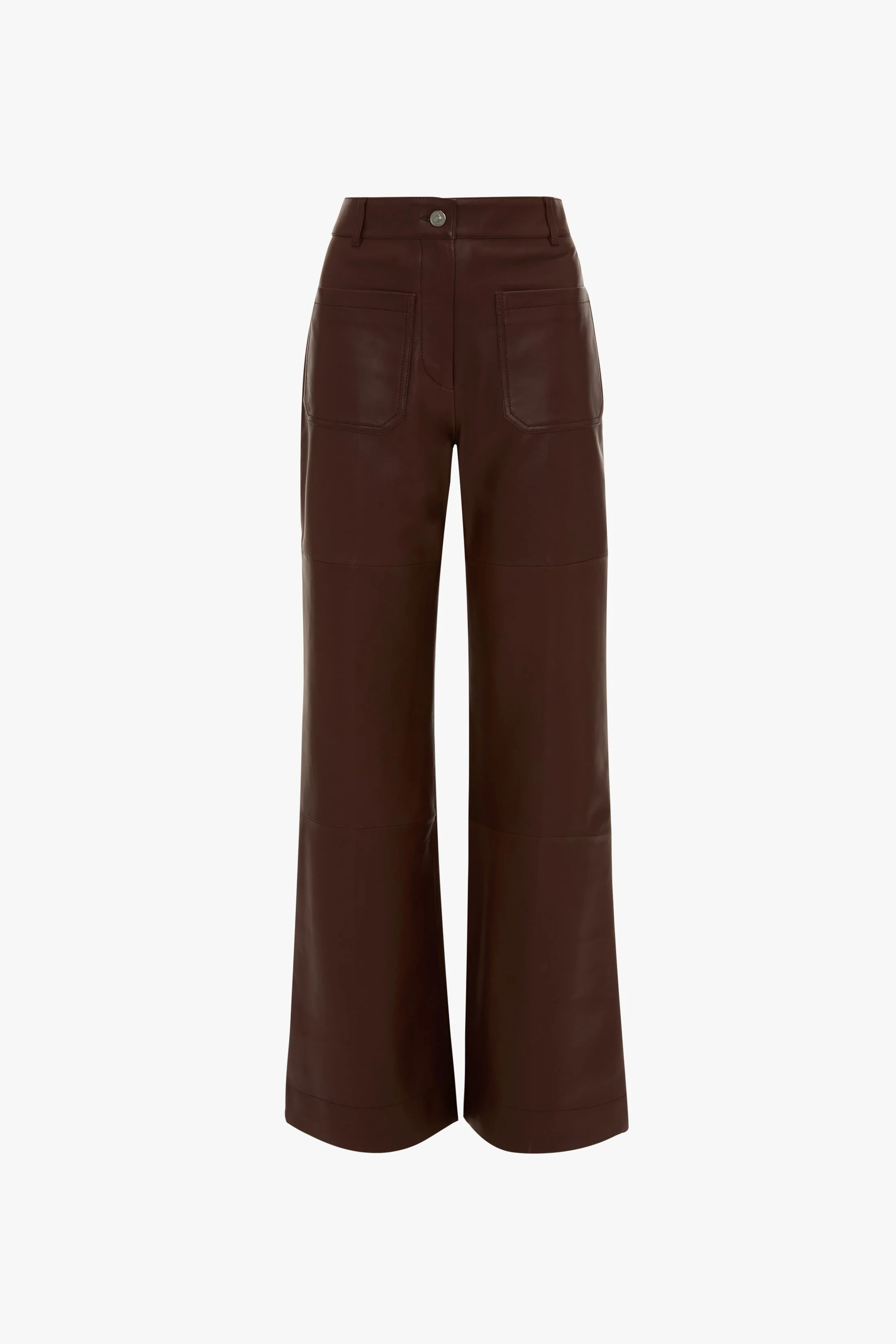 - Lamb leather - High rise - Front and back patch pocket detail - Wide leg - Main: 100% Leather - Lining: 100% Viscose - Leather specialist dry clean only - Made in Mauritius A classic from the Victoria Beckham archive, the Alina Trouser is reimagined in supple nappa leather and half-lined in soft cotton for the new season. With a super-high waist and flared leg, it has an elongating silhouette, while traditional front and back patch pockets bring a 1970s sensibility. Presented in Soft Burgundy, it makes a confident statement. SIZE & FIT - Intended to be fitted around the waistline, take a larger size for a more relaxed fit - The model height is 5'10’’/178cm and is wearing a size 6