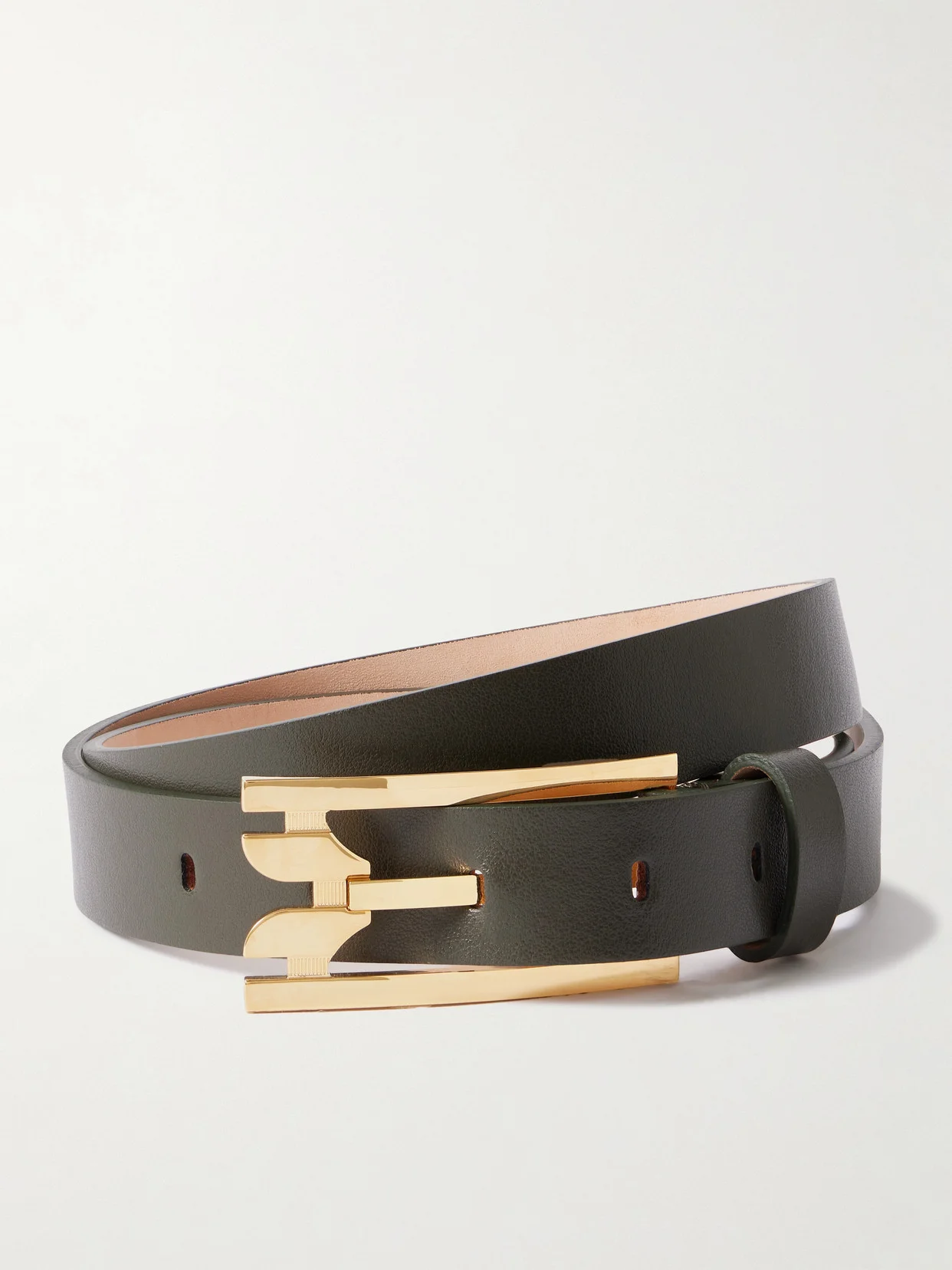 Victoria Beckham understands the impact a polished belt can have on an outfit. This one has been made in Italy from dark-olive leather and anchored with a gold-tone logo buckle, which nods to the designer's initial.