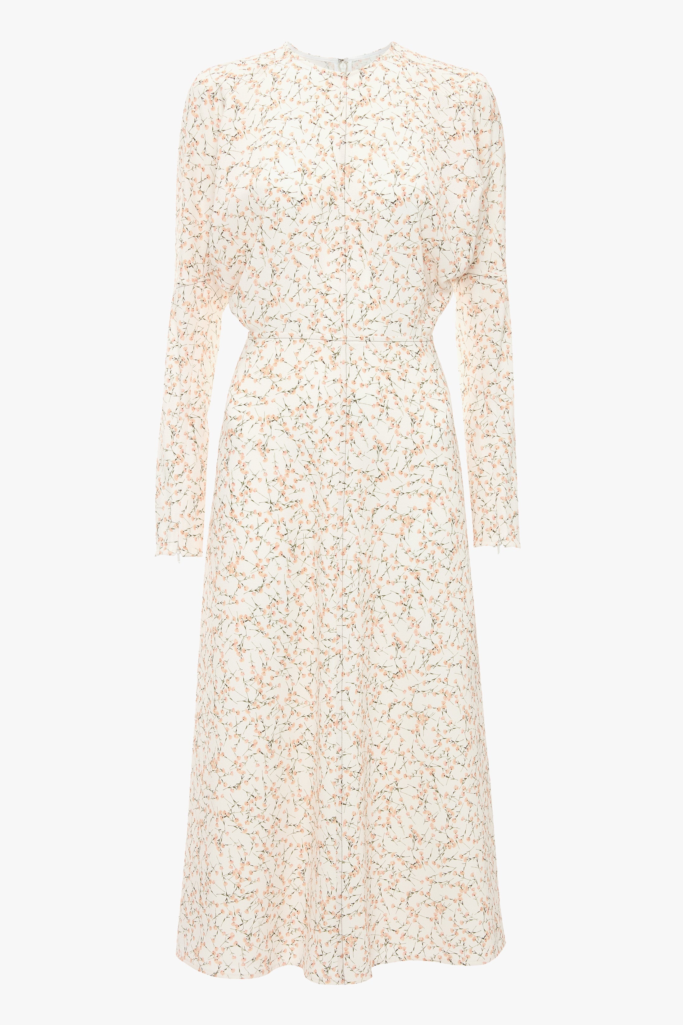 A charming peach floral print and demure silhouette bring a modern refinement to the Dolman Midi Dress. Cut from a fluid cady, it has a softly sculpted waistline and relaxed fit through the bodice. Concealed zips at the wrist and a voluminous underarm drape add contemporary talking points, while tonal topstitching brings visual interest. Size & Fit - Fits true to size, take your regular size - Fitted at the waist and more relaxed fit through bodice and hip - The model height is 5'10''/179cm and is wearing a size 6 Product Details - Dolman sleeve - Draped feature at sleeve underarm, fitted sleeve through the forearm - Midi length silhouette - Tonal topstitching - Concealed zip with hook and eye closure at back - Concealed zip opening at cuff - 95% Polyester 5% Elastane - Dry clean only - Made In Lithuania