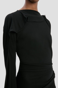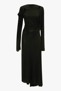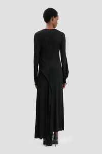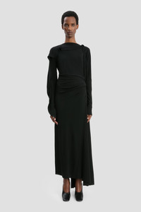 Discreet but directional talking points elevate the Long Sleeve Draped Jersey Midi Dress from a traditional LBD to a contemporary classic. Distinguished by its draped neckline with cord piping, it also features elegant draping at the sleeves and back skirt. The waistline is defined by tactile pleats, while an asymmetric hemline and sleeves add modern flair. Size & Fit - The model height is 5'11’’/180cm and is wearing a size 6 - Fits true to size, take your regular size Product Details - Draped detail jersey midi dress - Draped front neckline with cord piping detail - Drape detail along neckline, sleeve and back skirt - Pleats to create drape detail at the waist - Asymmetric hem - 100% Viscose - Dry Clean Only - Made in Portugal