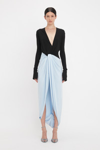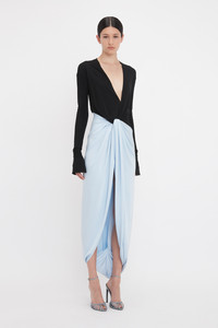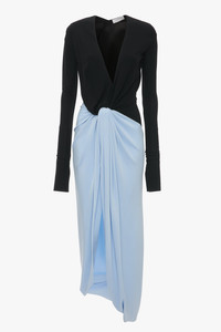 A sophisticated sexiness defines the Long Sleeve Knot Detail Jersey Dress. A sensuous deep-V neckline and thigh-high front drape provide bold talking points, while long-sleeves add a demure counterpoint. A dramatic Black-Iceberg two-tone colourway adds a contemporary edge enhanced by subtle design details including asymmetric shoulder seams and splits at each cuff opening. Product Details - Stretch jersey fabrication - Deep v-neckline - Asymmetric shoulder seams - Long sleeves with splits at cuff opening - Skirt cut in contrast fabric - Drape detail on front skirt - Fitted through the waist and sleeve - Fits true to size, take your regular size - The model height is 5'10''/179cm and is wearing a size 6 - 100% Vilscose - Dry clean only - Made In Portugal