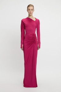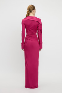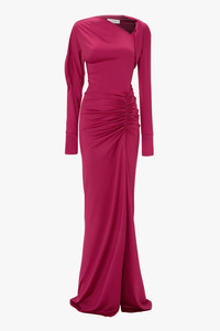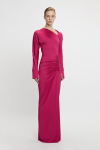 A slash neckline and twisted drape at the neckline and sleeve imbue this gown with a provocative point of difference. Presented in a confident shade of Cherry for the new season, the Long Sleeve Slash Neck Jersey Gown has a streamlined silhouette with a tactile gathered detail at the hip. Distinctive design features include asymmetric sleeves with splits at the cuff and a split at the front of the skirt. Size & Fit - Fits true to size, take your regular size - The model is 179cm and is wearing a size 6 Product Details - Floor length - Stretch jersey fabrication - Slash neckline - Asymmetric sleeves with splits at cuff - Twisted drape around neckline and sleeve - Gathered detail at the hip - Front skirt split - Dry clean only