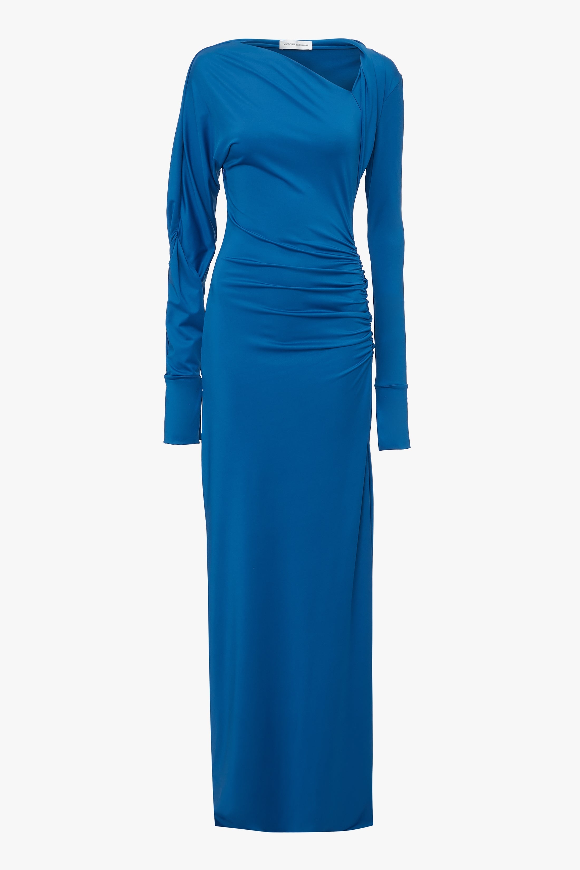 Evening gowns with a provocative point of difference are a house signature. New to the archive this season is the Long Sleeve Slash-Neck Jersey Gown in energetic Ocean Blue, as seen on the AW24 runway. Distinctive design features include a slash neckline with twisted drape, gathered detailing at the hip, asymmetric sleeves with splits at the cuff and a front skirt split. Crafted from stretch jersey, it creates a beautifully streamlined silhouette. Product Details - Stretch jersey fabrication - Slash neckline - Asymmetric sleeves with splits at cuff - Twisted drape around neckline and sleeve - Gathered detail at the hip - Front skirt split - Concealed zip closure at side seam - The model is 177cm and is wearing a size 6 - 90% Polyester 10% Spandex - Dry clean only - Made in Portugal