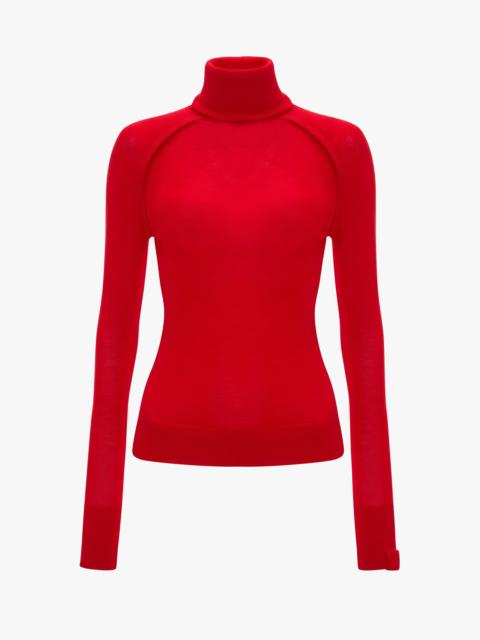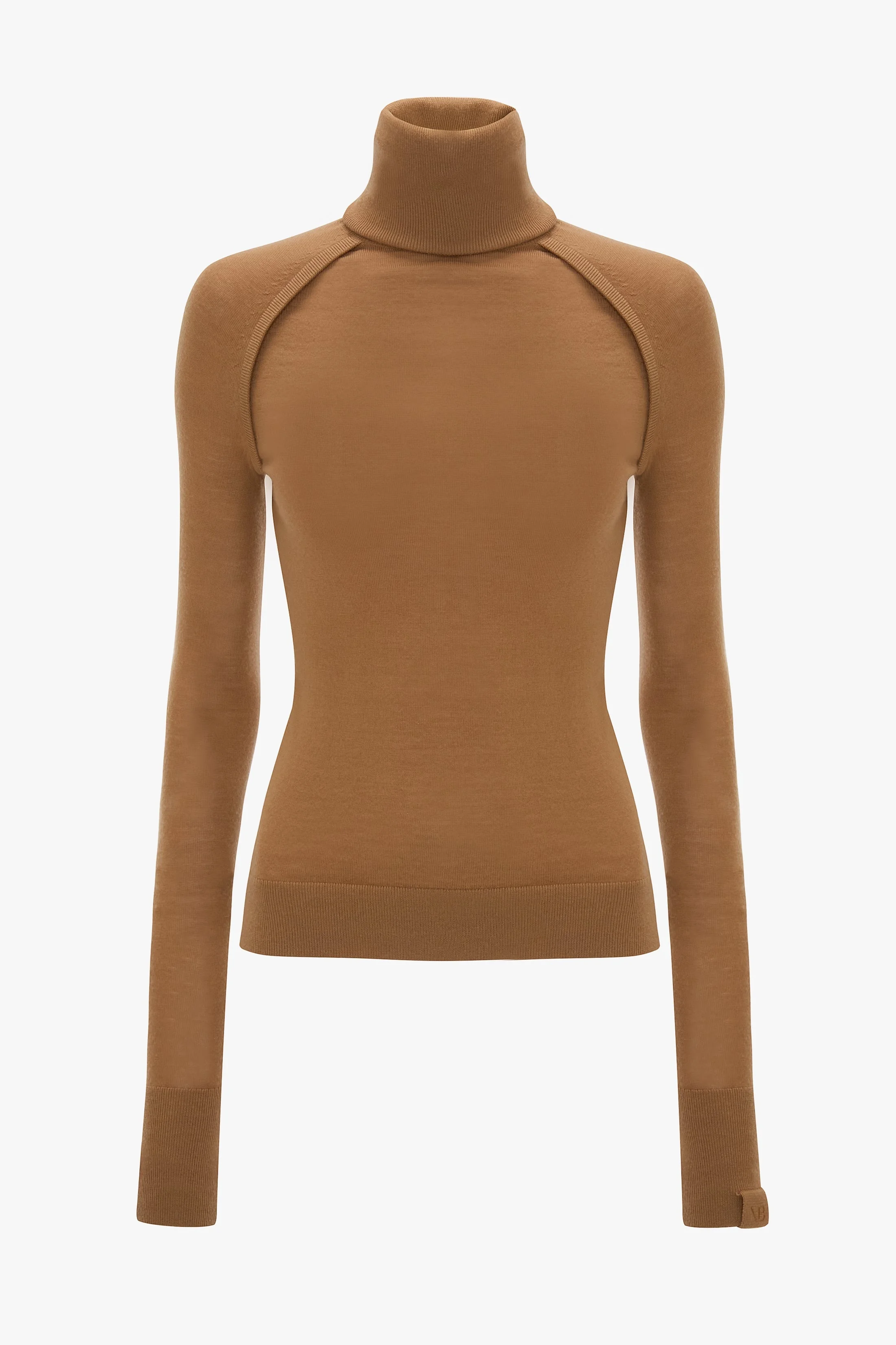 Crafted from 100% merino wool, the High Neck Top has a slim cut, roll-neck design and longer-length sleeves with thumb holes for a figure-defining silhouette. Ribbed trims along raglan shoulders add texture and definition, while a branded embroidered tab at the cuff adds an elevated point of difference. Presented in versatile Camel, it is a sophisticated wardrobe basic. Styled with the Cinched Trouser & Frame Belt Size & Fit - Fits true to size - The model height is 5'10''/178cm and is wearing a size XS Product Details - High roll neck - Ribbed trims along raglan shoulder - Slim fit - Thumb holes - Tonal branded embroidery tab - 100% Merino Wool - Dry clean only - Made in China