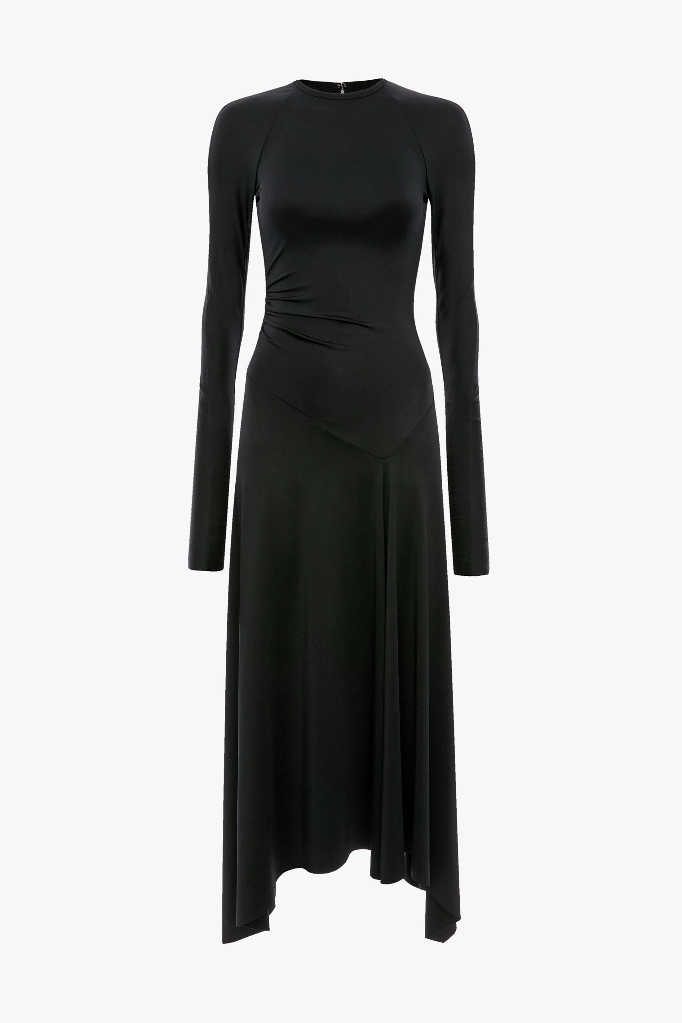 - Midi length dress with asymmetric hem - Stretch jersey fabrication - Round neckline - Long sleeves with thumb hole - Concealed centre front zip - Panelling and ruching details - 90% Polyester 10% Spandex - Made in Portugal An understated but distinctive piece, the Midi Dress in classic Black has a modest round neckline, long sleeves with thumb hole and concealed zip at the front. Elevated with tactile ruching and a playful asymmetric hemline, it has wear-anywhere appeal. SIZE & FIT - The model is 5'10’’/178cm and is wearing a size 6 - Fits true to size, take your normal size