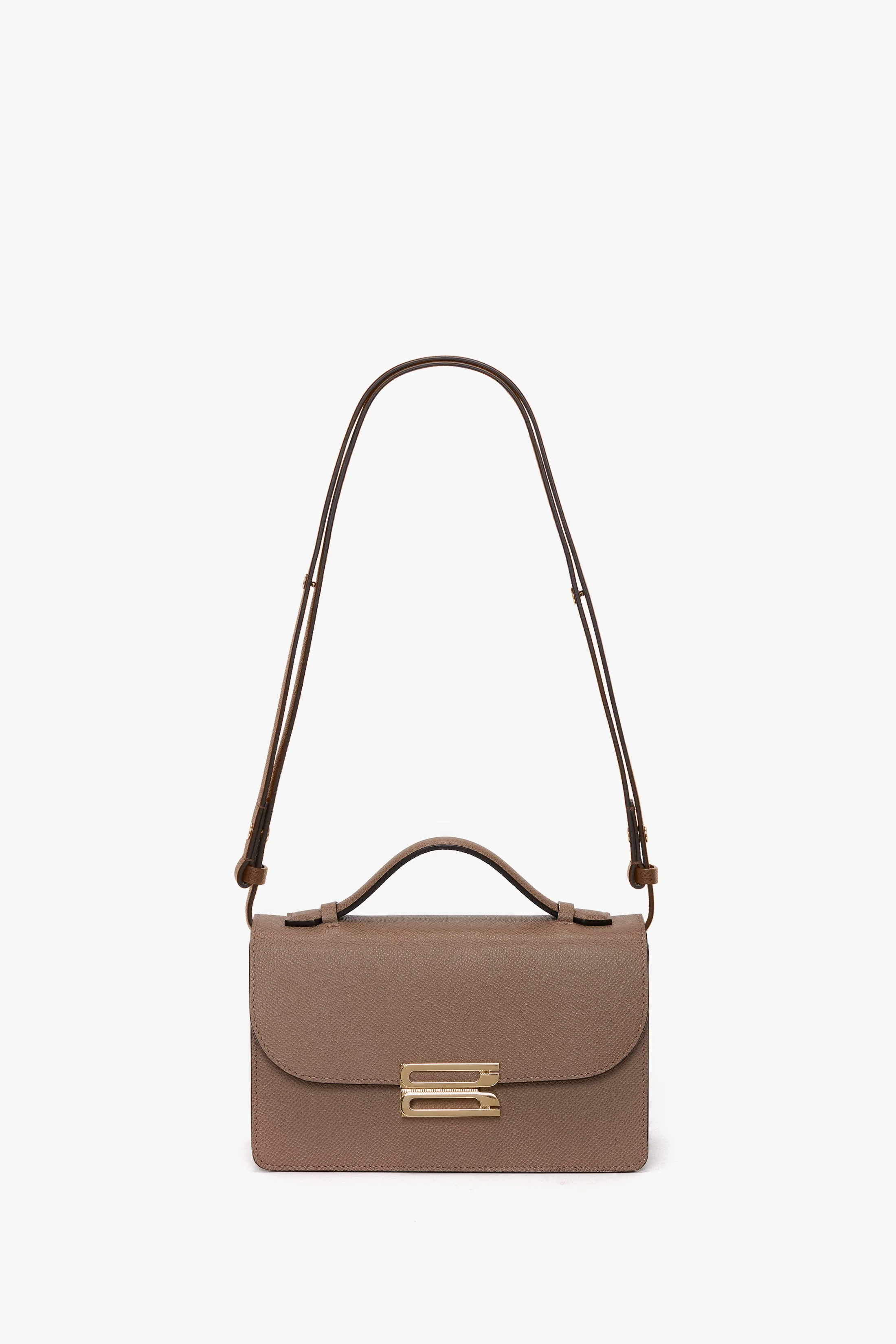 A new silhouette to the Victoria Beckham leather goods edit, the Mini Dorian Bag in dove grey is exquisitely crafted in Italy from textured calf leather and microsuede lining. It has a removable ‘smart strap’ with snap buttons for versatile styling as a shoulder, crossbody or clutch bag and features the house’s signature gold branding, which includes the discretely stamped address of Victoria’s London studio (N.202) followed by a unique serial number. Size & Fit - Height: 14cm Width: 20cm Depth: 8cm - Drop: 49cm - longest length. Drop: 43.5cm - longer length. Drop: 27cm - Shortest length Product Details - Top handle mini bag - The smart strap has snap buttons that easily allows length of strap to be changed - Can be worn on the shoulder or across the body - Internal double compartment - Microsuede lining - Features our signature gold branding with VB logo - Unique serial number per bag - 100% Leather - On leathers, regularly apply a very small amount of nourishing cream and buff gently using a cloth - Made in Italy