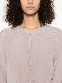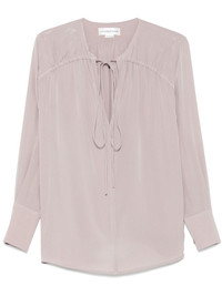New CDC blouse Highlights - Light purple - Front tie fastening - Long sleeves - Buttoned cuffs - Gathered detailing Imported Composition Silk 100% SIZE & FIT Model measurements Height 5 ft 10 in(1.79 m) Bust/Chest 31.88 in(81 cm) Hips 35.43 in(90 cm) Waist 23.62 in(60 cm) FittingInformation Designed to be unstructured, offering a loose fit throughout The adjustable drawstring means that you can adjust this piece’s fit to suit your comfort and preference Made from a lightweight non-stretch fabric