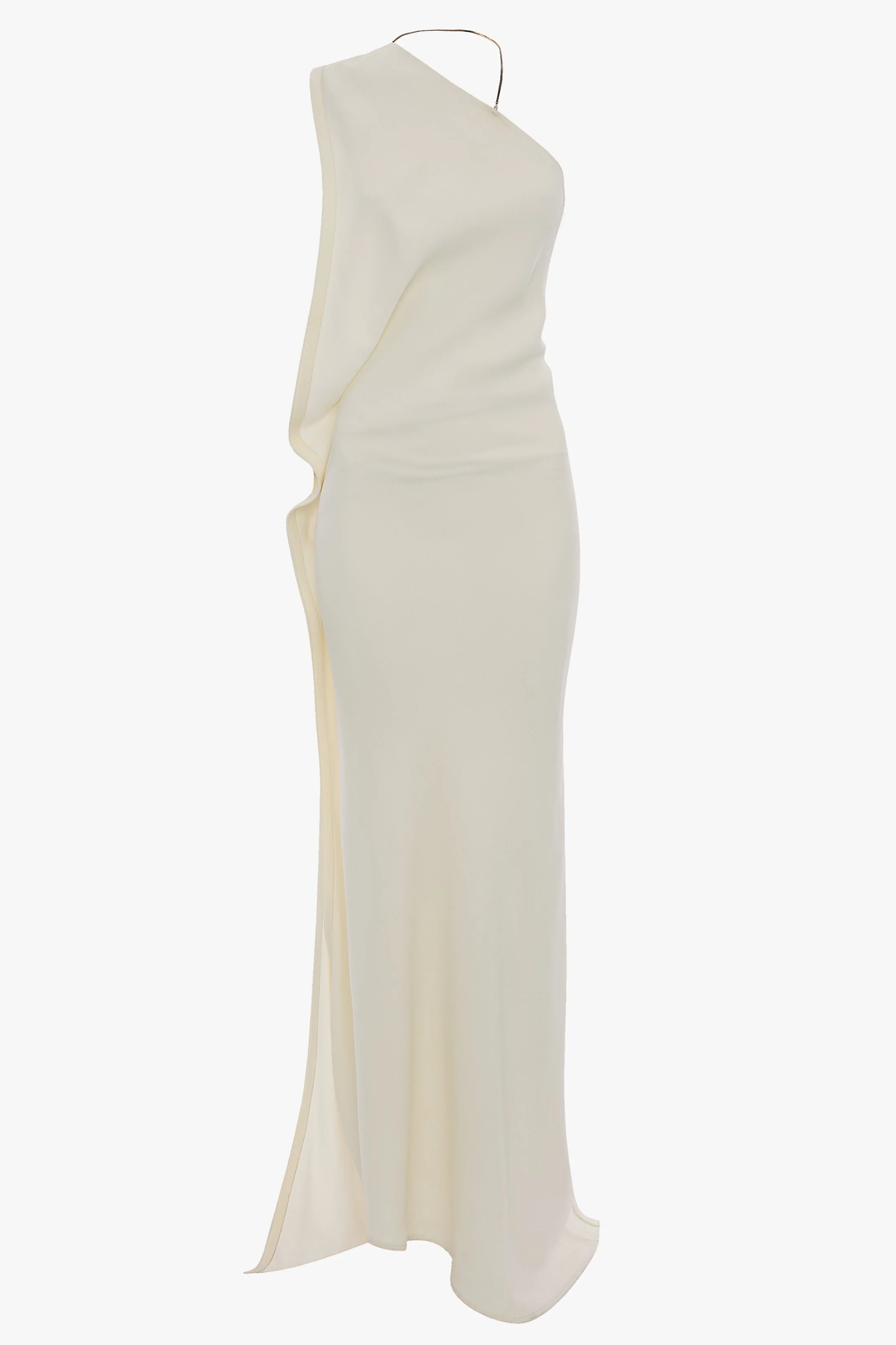 - Fluid textured twill fabrication - Singular shoulder strap with side drape - Chain neckline detail - Concealed zip with hook & eye closure - Skirt side split - Asmmetric hem - Fully lined - 100% Viscose - Made in UK The One Shoulder Chain Detail Dress in romantic Ivory is crafted from textured twill, fully lined and cut on the bias for a sensuous silhouette. A side-bodice drape, side-seam splits and asymmetric hemline bring fluidity, while a chain trim detail at the neckline adds understated embellishment. SIZE & FIT - The model is 5'9’’/177cm and is wearing a size 6 - Fits true to size, take your normal size - Fitted through the hip