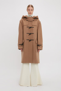 The retro charm of a traditional duffle coat is harnessed and elevated with the house’s signature sophistication in the Oversized Duffle Coat in Camel. Featured on the AW24 runway, it has classic toggle closures, front and back stitched-down storm flaps and deep front patch pockets with flaps. Topstitching at the seams and a metal B-frame trim on the left add discrete design features. Product Details - Toggle detail - Hood and front neck guard with toggles - Stitched down storm flaps - Deep front patch pockets - Sleeve belt with toggles - Topstitch detail at the seams - B metal trim - The model is 177cm and is wearing a size 14 - Main: 100% Virgin Wool, Lining: 100% Viscose, Trim: 100% Leather - Dry clean only - Made in Lithuania